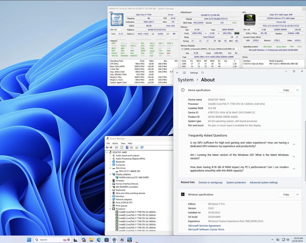 Custom built gaming computer in good condition. New installation of Windows 11 Pro (fully activated) with the October 2025 updates installed. ----- Processor: Intel Core i7 7700 - 3.6GHz | 4.2 GHz Turbo Motherboard: Gigabyte Q170M-MK Graphics Card: NVIDIA GTX 1660 Super 6GB RAM: 16GB DDR4 2400MHz SSD: 480GB Operating System: Windows 11 Pro (25H2) WiFi: Yes Bluetooth: Yes