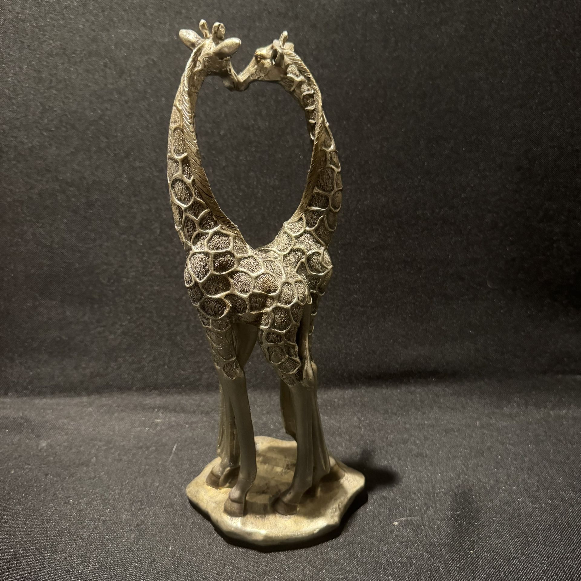 cute sparkly giraffes kissing statue figurine. about 10" tall. hard to see in pic but there is a slight sparkle to it from glitter in the material. very cute shelf piece.