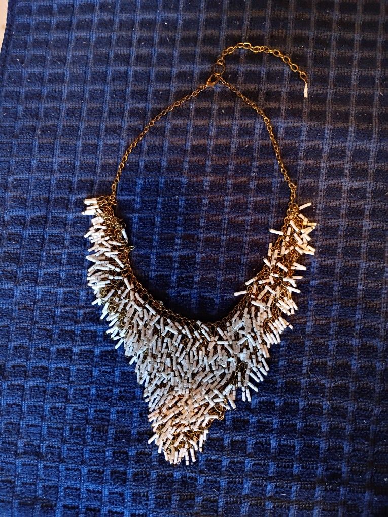 1970s Vintage White Beaded Necklace on gold color chain, lobster claw enclosure, 17" length plus