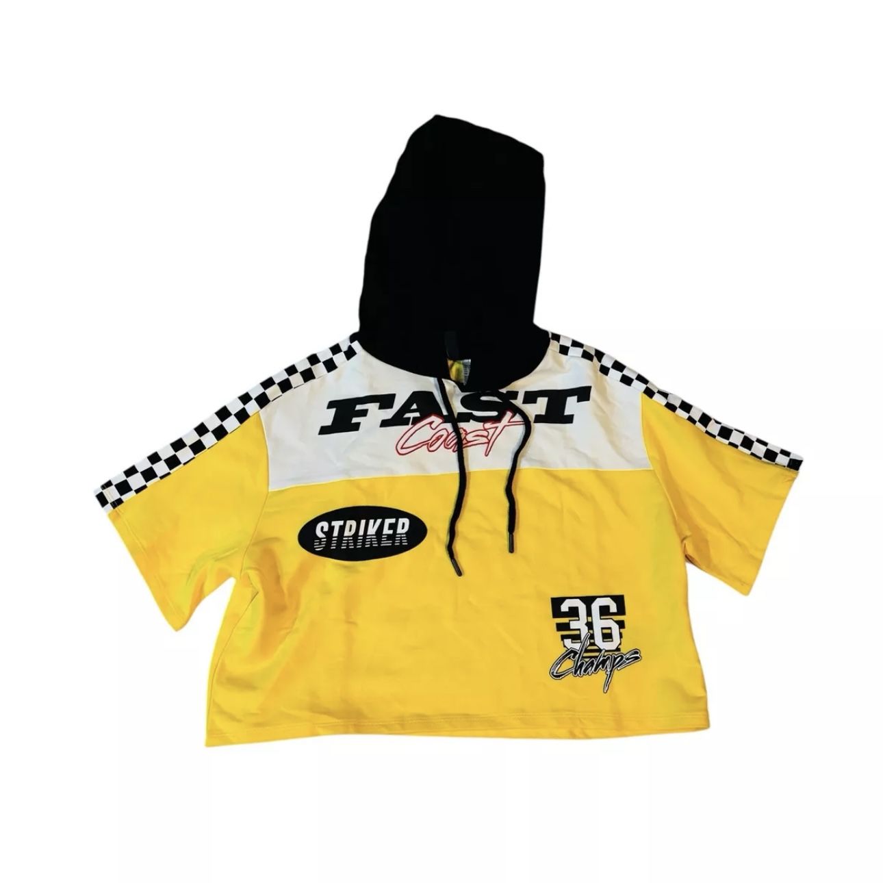 H&M Divided Size:Medium Women Hoodie Condition: Pre-owned” Length: 20 inches Shoulder to Shoulder: 17 inches Color: Black, White, and Yellow Gtaphic “ Fast Coast” Cropped