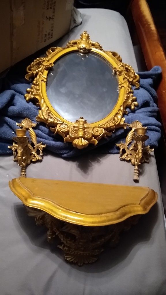 New in box, never used. Only opened to photograph. Set includes coordinating mirror, shelf and pair of candleholders. The approximate measurements are as follows:mirror 25.5" x 18", shelf (top) 17.75" x 7.25" and candles 8.5" x 5.5" . Perfect for a foyer. ** Reasonable offers considered. Low ball offers will be ignored."
