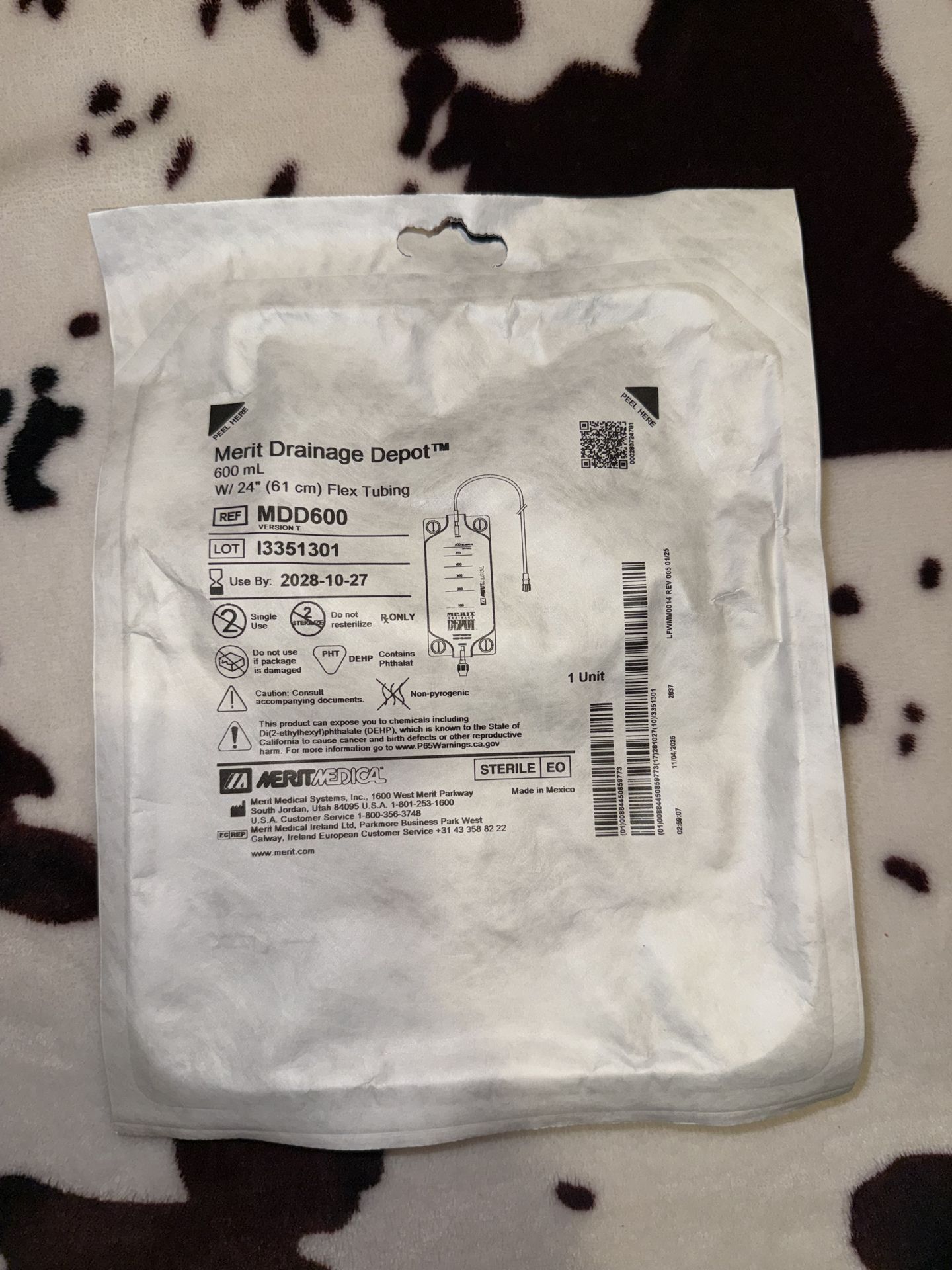 Merit Drainage Depot™ 600 mL W/ 24™ (61 cm) Flex Tubing REF MDD600 VERSION T LOT: 1(contact info removed) Use By: 2028-10-27