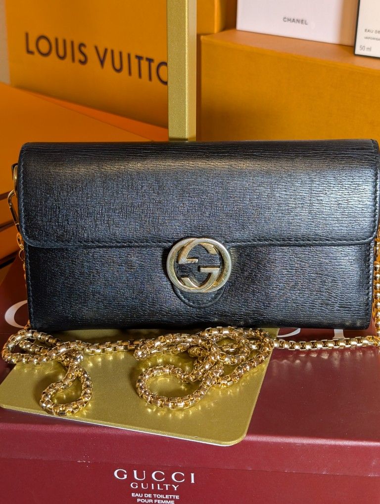 Black with interlocking GG in front. Pre loved still in very good condition. See photos before purchasing. Includes crossbody gold chain strap, wallet insert, COA