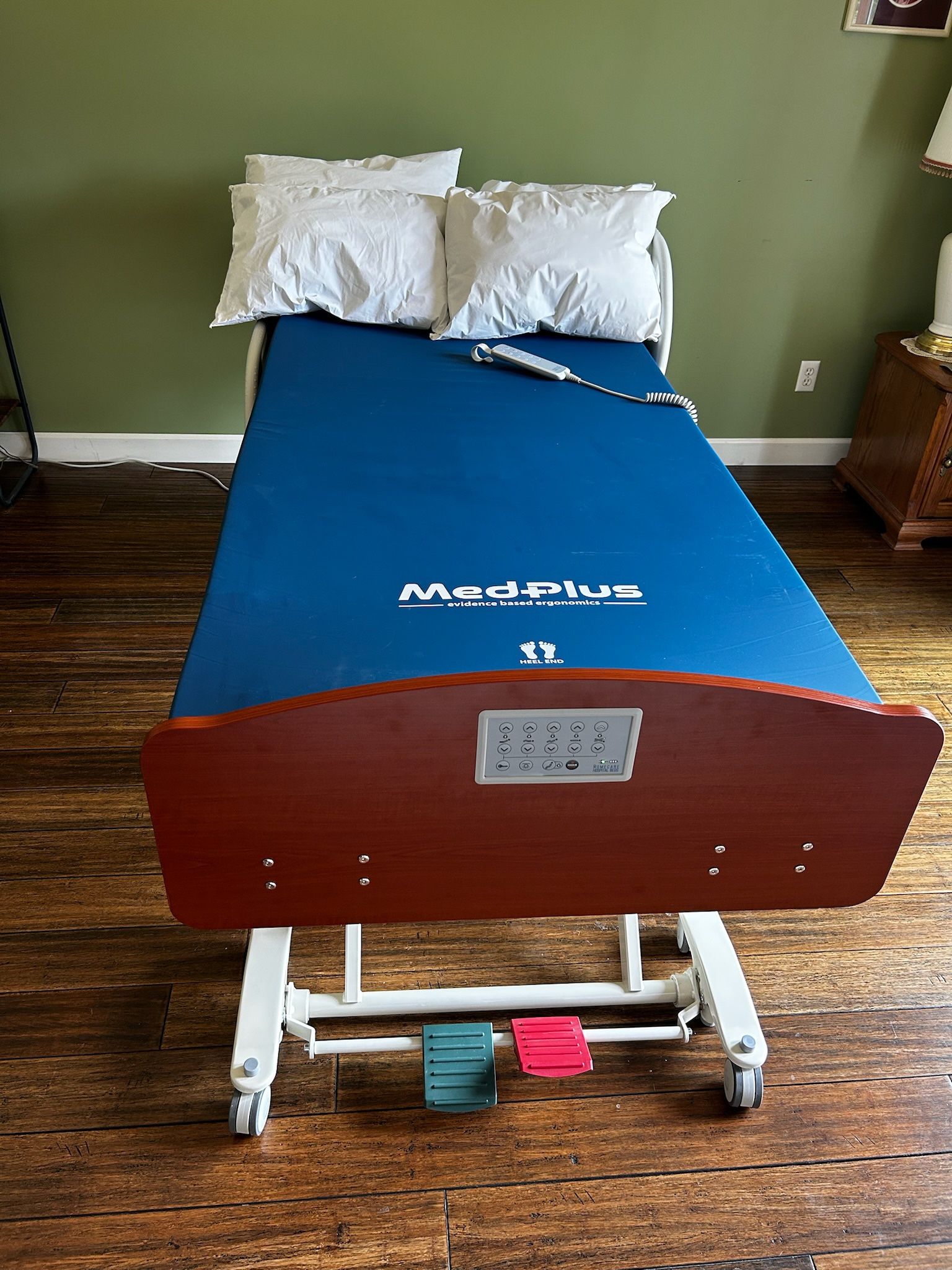 OBO - Lynacare Hi-Low Hospital Bed w/ PressurePlus T-Zone Pressure Redistribution mattress. Purchased in January 2025 for $4,000 w/ available options. Bed used for 6 months - mattress for only a few weeks. It is an amazing bed that can be put in endless positions and heights, including tilting the head or foot end to help slide and readjust your loved one. We are asking $2,750 or best offer. https://offerup.co/faYXKzQFnY?$deeplink_path=/redirect/ Also available with purchase of bed: white cotton sheet sets, vinyl coated pillows, positioning bed pads, one-size hospital gowns, transfer belt w/ handles, bedside table, and wheelchair. Drive four-wheeled rollator walker (+$100) & 8-foot metal foldable ramp (+ $250)