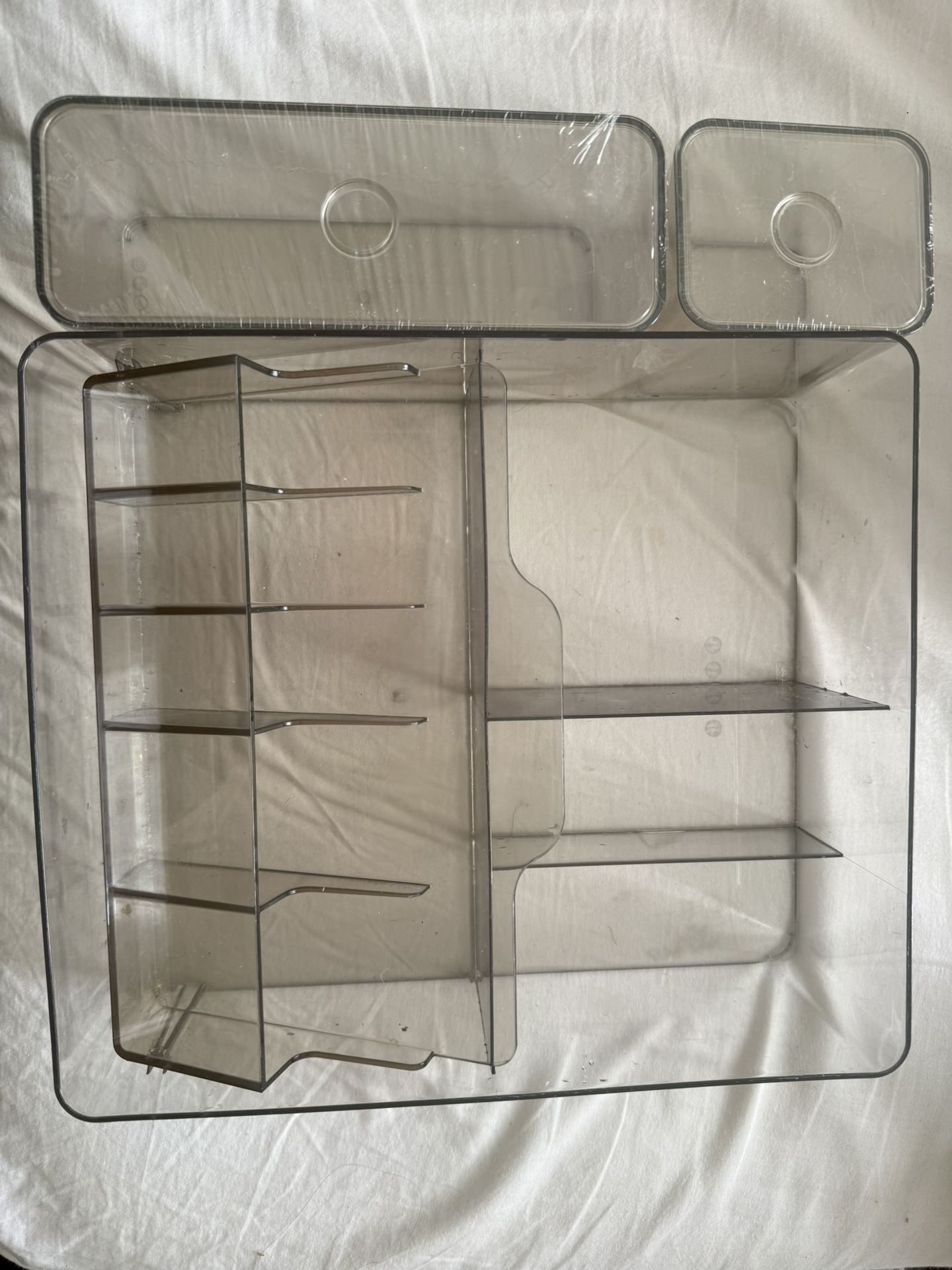 IKEA Godmorgan organizer with two smaller containers. I do not have the dimensions. For this vanity set as it is discontinued since last year. Please google.