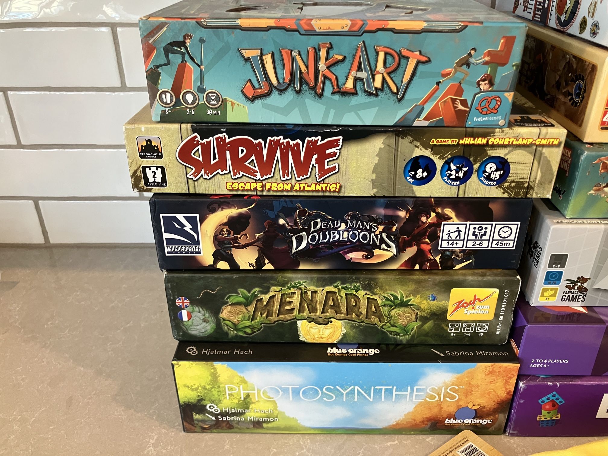 Board Games - prices as listed Junk Art $45 Dead Man’s Doubloons $20 Photosynthesis $20 Decrypto $15 Chariot Race $10 Juicy Fruits (not pictured) $15 Junk Orbit (New) $15 Medium $5 Mental Blocks $20 Pickles to Penguins $5 The Crew $5 Abandon All Artichokes $10 Fuse $10 Flinch (incomplete)$3 Friday (missing markers) $3 Qbitz $5 Lift It $10 Squint $5 Trapwords $10 Word Wipeout $5 Canasta Caliente $5 Set $5 Bubble fever $3 Happy salmon $5 My first Banana grams $5 Discount for multiple items. Smoke-free home. All games are complete unless otherwise noted. May ship. Buyer pays shipping.