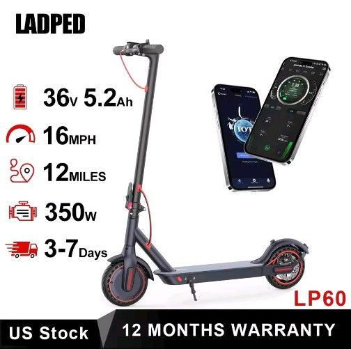 The LADPED LP60 8.5INCH Solid Tire Electric Scooter is a high-performance model designed for city commuting. With a powerful 350-watt motor and a 36V 10.5AH battery, it can reach speeds of up to 15.5mph (25km/h) and provide a maximum range of 30km. The 8.5-inch solid tire and iron pedal material ensure durability and stability, making it suitable for adults up to 265lbs (120kg). Featuring front and rear braking, digital display, lightweight design, and cruise control, this foldable electric scooter is perfect for outdoor riding and sports activities. The package includes a user manual, electric scooter, charger, and tool set, with a warranty of 1 year.