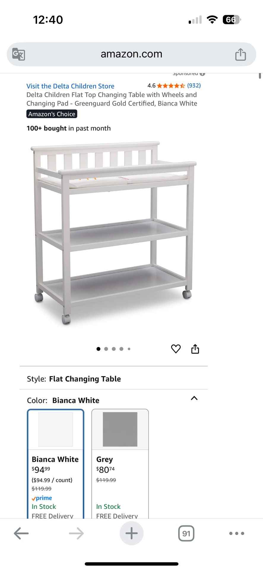 Delta Children Flat Top Changing Table with Casters, Greenguard Gold Certified, Bianca White