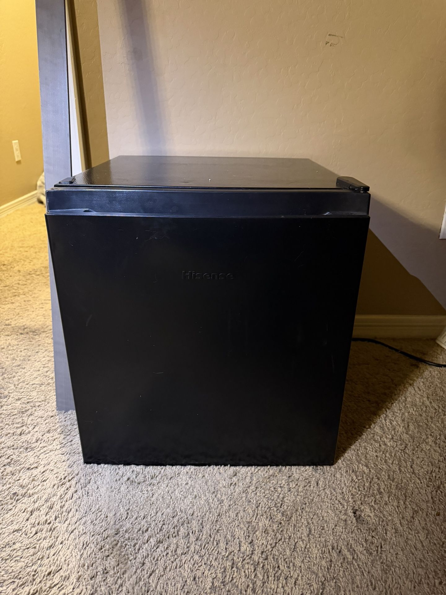 Smaller mini fridge, has changeable temperature plus a mini freezer that holds about 3 water bottles worth of space