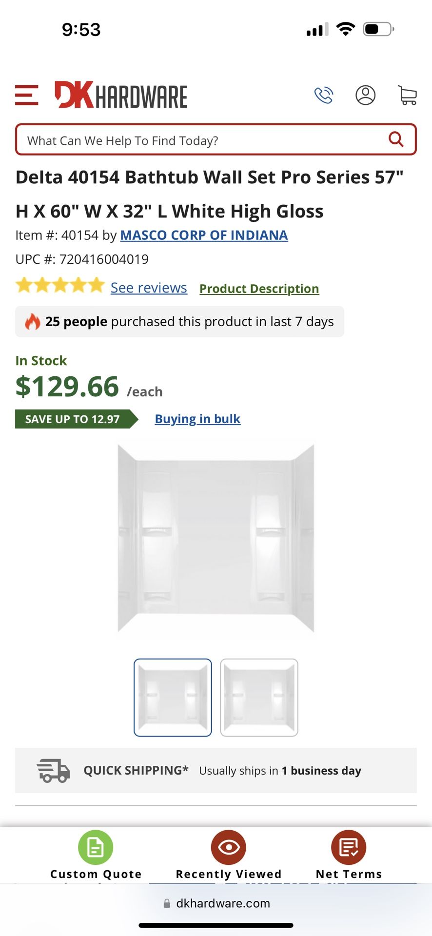 Delta 40154 Bathtub Wall Set Pro Series 57" H X 60" W X 32" New in box