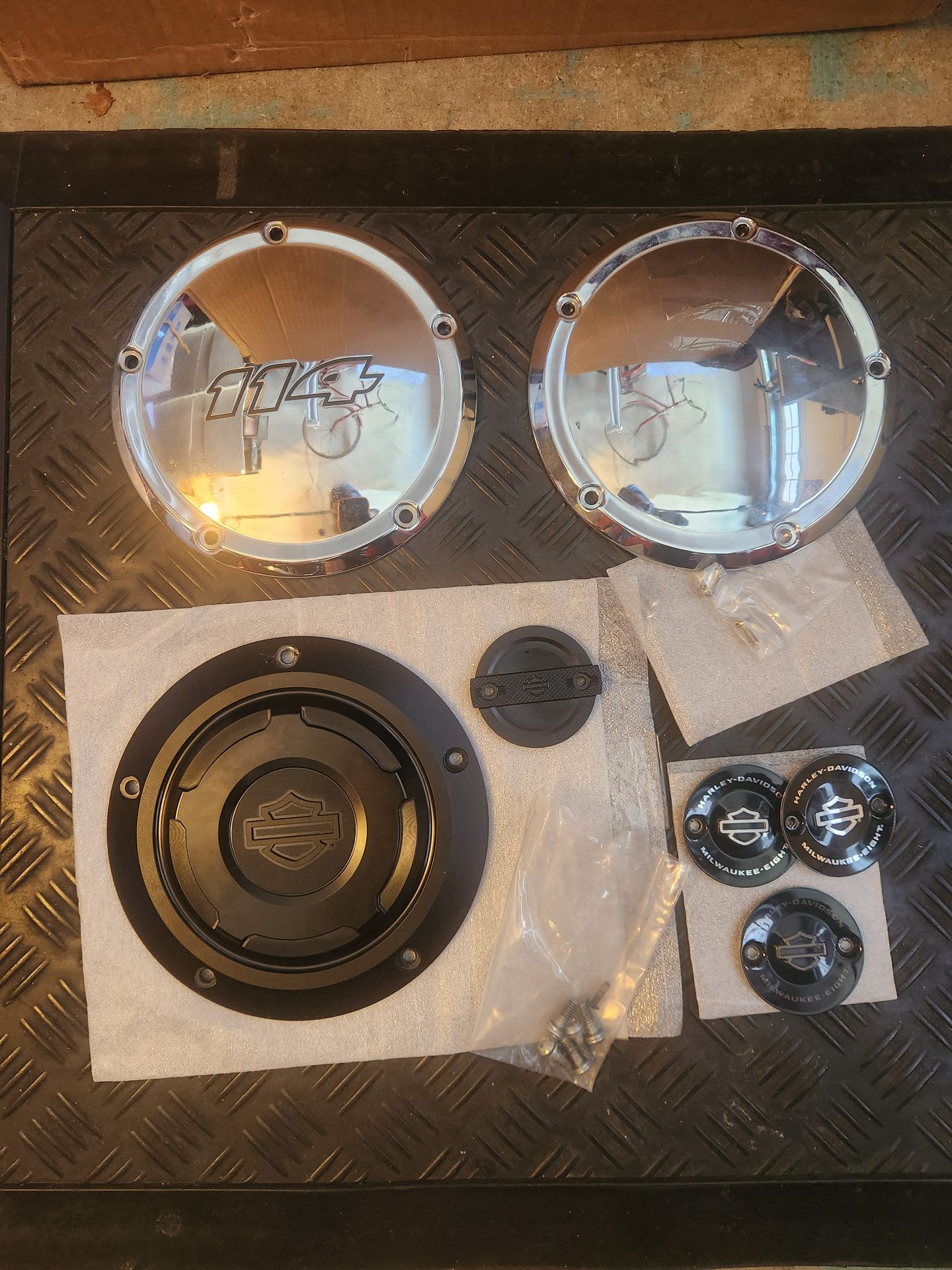 Primary covers and timing covers. Image two $15 each. Chrome and 114 Chrome cover $30 each. Switchback primary and timer cover 150 for both. Those are black. Thanks for looking and follow for Harley-Davidson parts. Check out my other Harley offers.