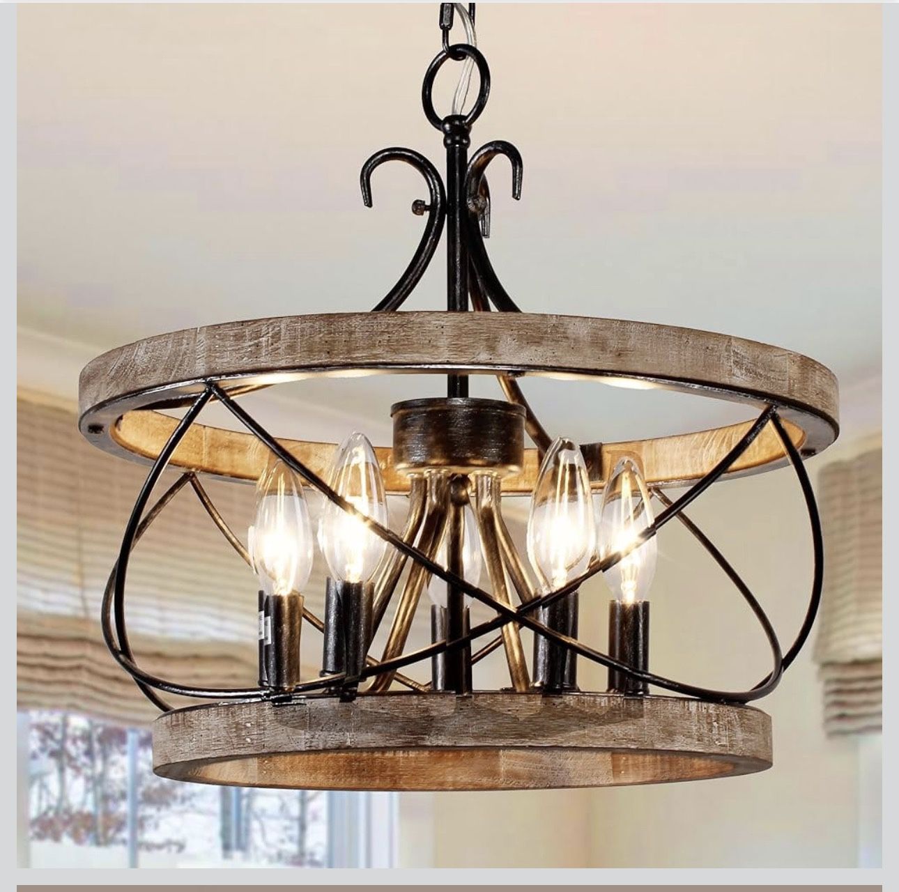Brand new chandelier — still in the box! ✔️ Rustic farmhouse style (wood + metal) ✔️ 5 lights (E12 bulbs) ✔️ Adjustable chain up to 70” ✔️ ~20” diameter Perfect for dining room / kitchen