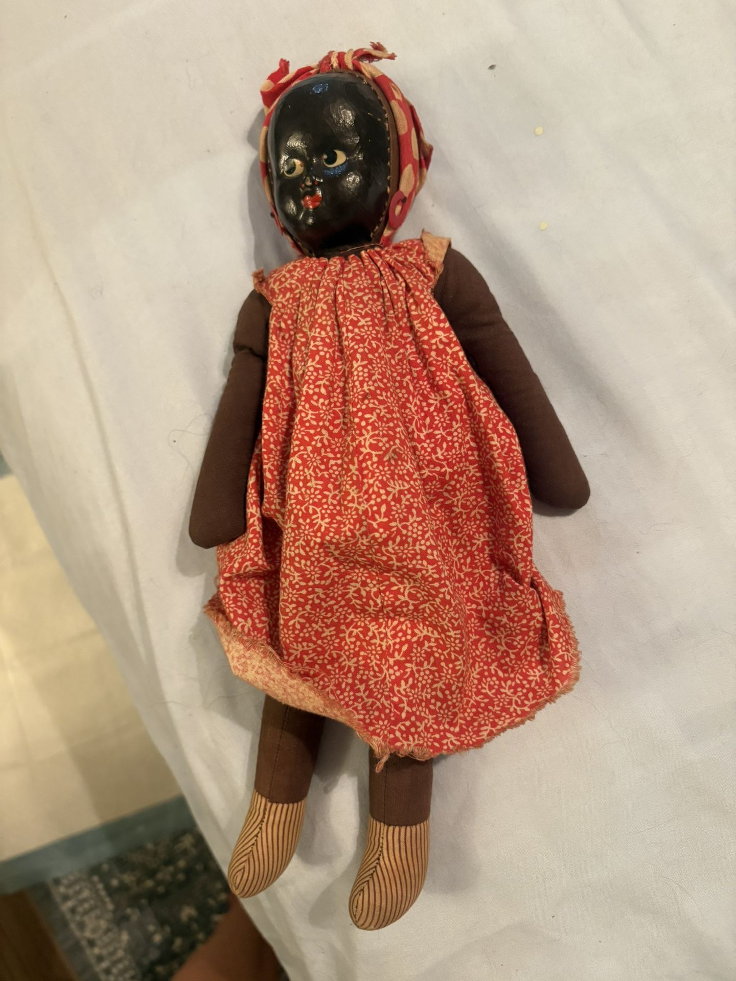She has a cloth body with plastic face that is sewed on not sure how old she is