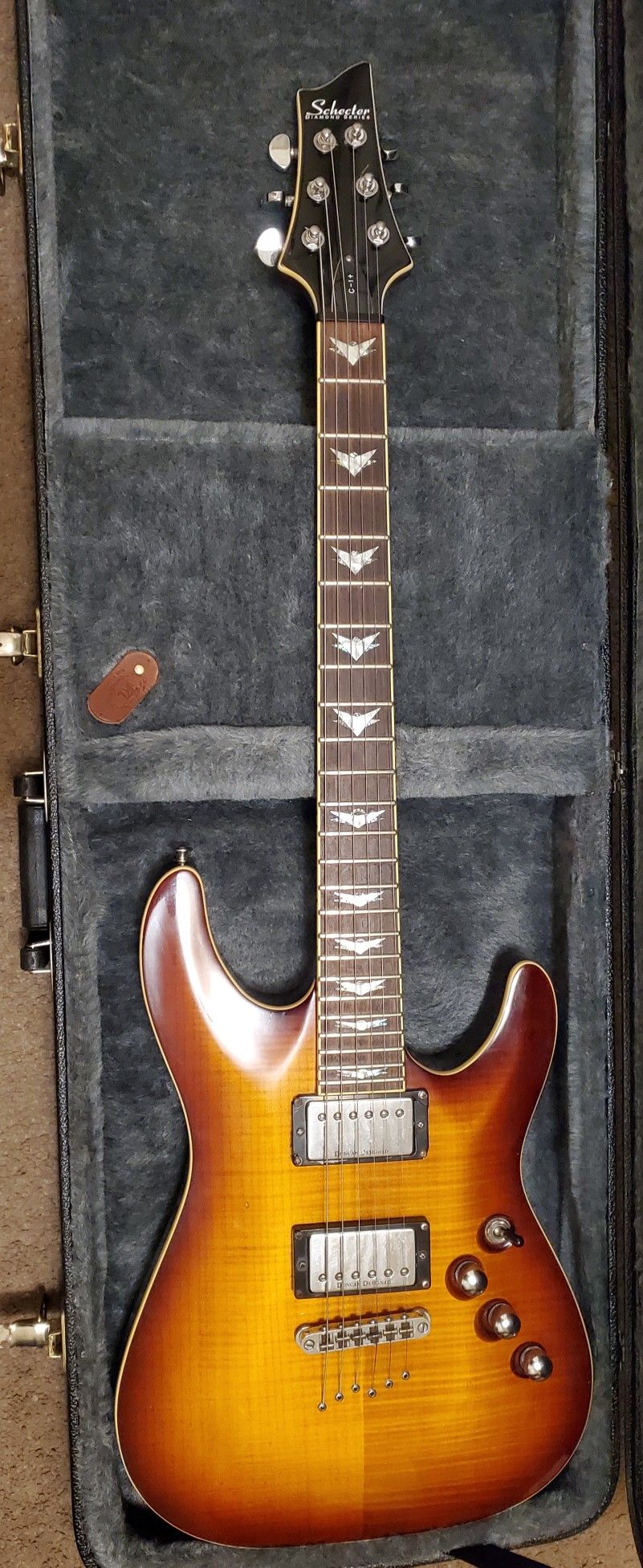 Schecter C-1+ Diamond Series electric guitar in very good condition. Features Duncan designed pickups , Grover tuners, and produces a great rock and metal tone as well as incredible clean tones. Finish is Flamed Maple Sunburst. No case included, just the guitar.