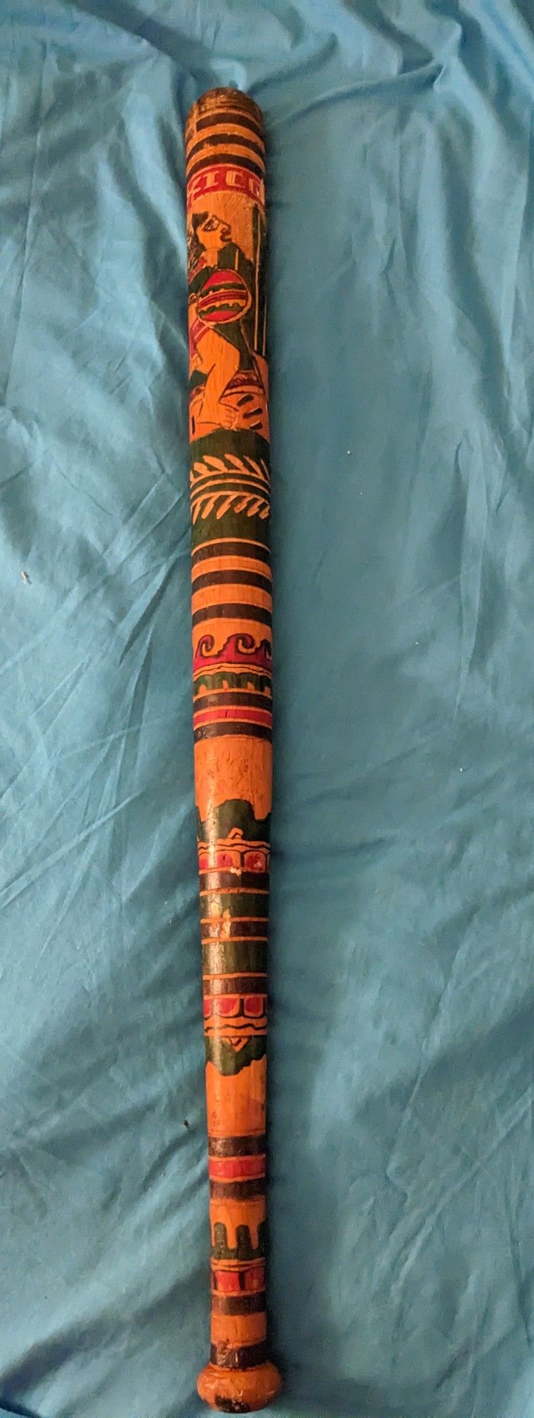 Used - Nice vintage piece - See pictures for condition. Vintage from the 1960s This wonderful wooden pinata stick is hand carved and hand painted all around with art decorations. It measures approx 30" long x 2.5" in the widest part.