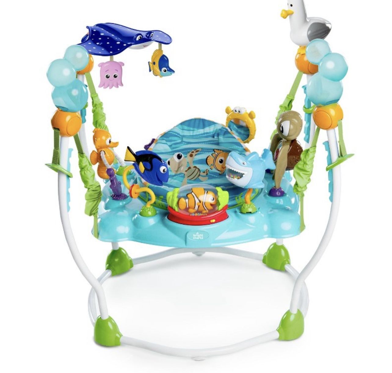 Normal used • Find fun with the best-selling Finding Nemo Sea of Activities Jumper • 13+ interactive activities with lights, songs, and sounds to spark joy & fun • Seat rotates 360-degrees for magic in every direction • Detachable Tad, Pearl & Mr. Ray toys; link to add more toys • Adjusts to 4 height positions to grow with baby • For ages 6 months to 1 year or up to 25 lbs & 30 tall • High backed seat for extra comfort & support; dimensions: 30.5 x 34.1 × 24.5 • Machine washable seat pad; 6 AA batteries required