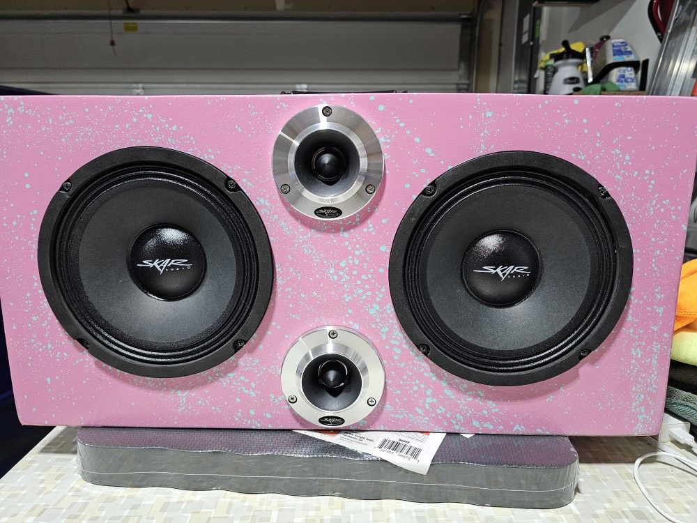 Portable bluetooth speaker powered by a milwaukee battery (not included) 2 skar 8" midrange speakers paired with 2 skar tweeters. Box painted pink with tiffany blue splatter.