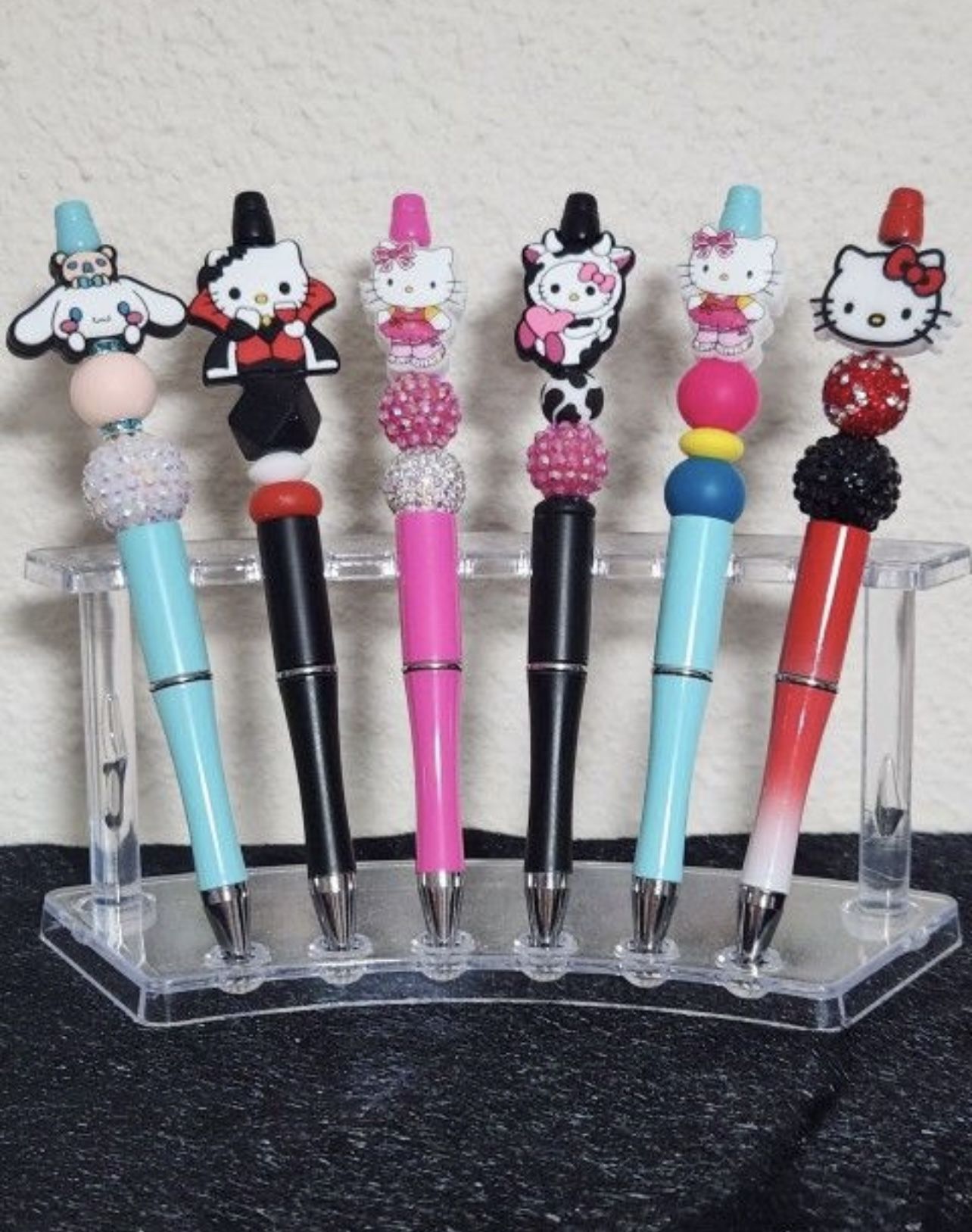1 pen- $7 add on extras 2 pens- $12 3 pens- $ 18 Wristlet- $10- $18 Mickey mouse, hello kitty, Starbucks, Chanel, Louis vuitton, Mexican concha, minnie mouse, karol g, Disney, Disneyland, Pixar, true crime, Wednesday, goth, lilo and stich, nightmare before Christmas, jack skellington, Message me for orders or pricing if interested These are ready for pick up . Pens, customized pens, hello kitty pens, Journaling, calendar, scrapbook, focal pens, planner, Erin condren, school, work, office, Keychain, girly, purse