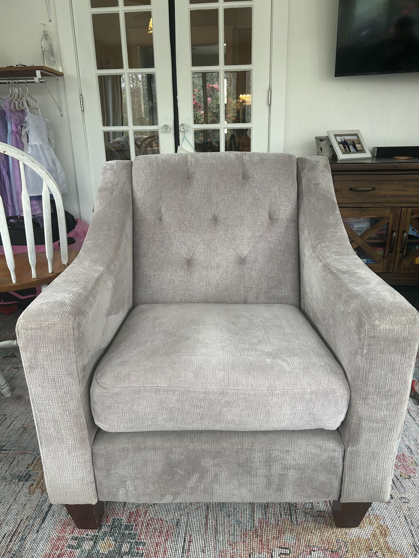 Gray chair, good condition. Only defect is the rip on the bottom of the cushion. H: 34” W: 32” L: 31”