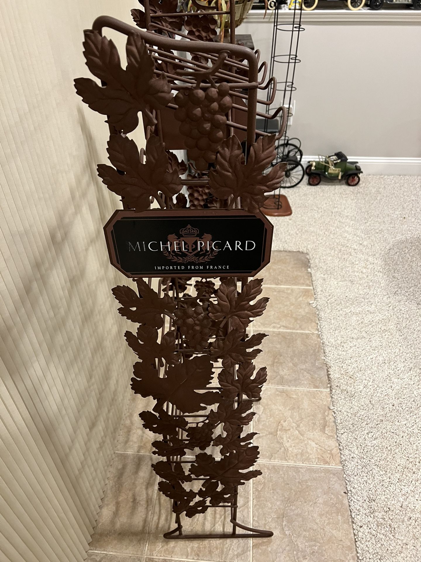 Incredible and unique wine rack. Brown metal that holds 48 bottles. Excellent condition that would make a perfect gift. High 52”, length 18” Located by Simsbury Library, Simsbury CT Cash only and local pickup.