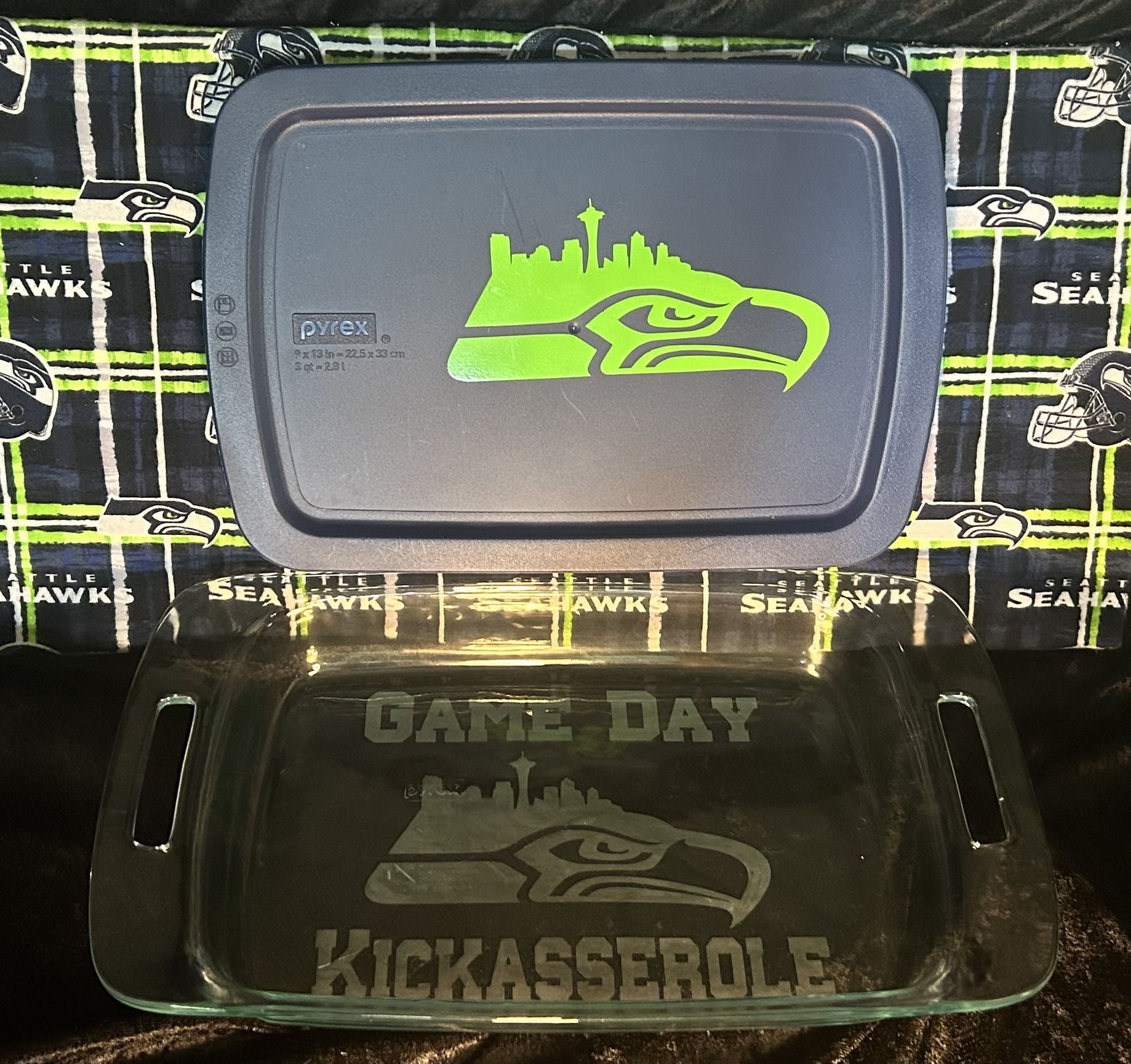Seahawks Game Day Kickasserole dish with lid. 9x13 Pyrex Grab and Go dish. Custom etched. I can personalize it with a first or last name instead of Game Day at no extra charge.