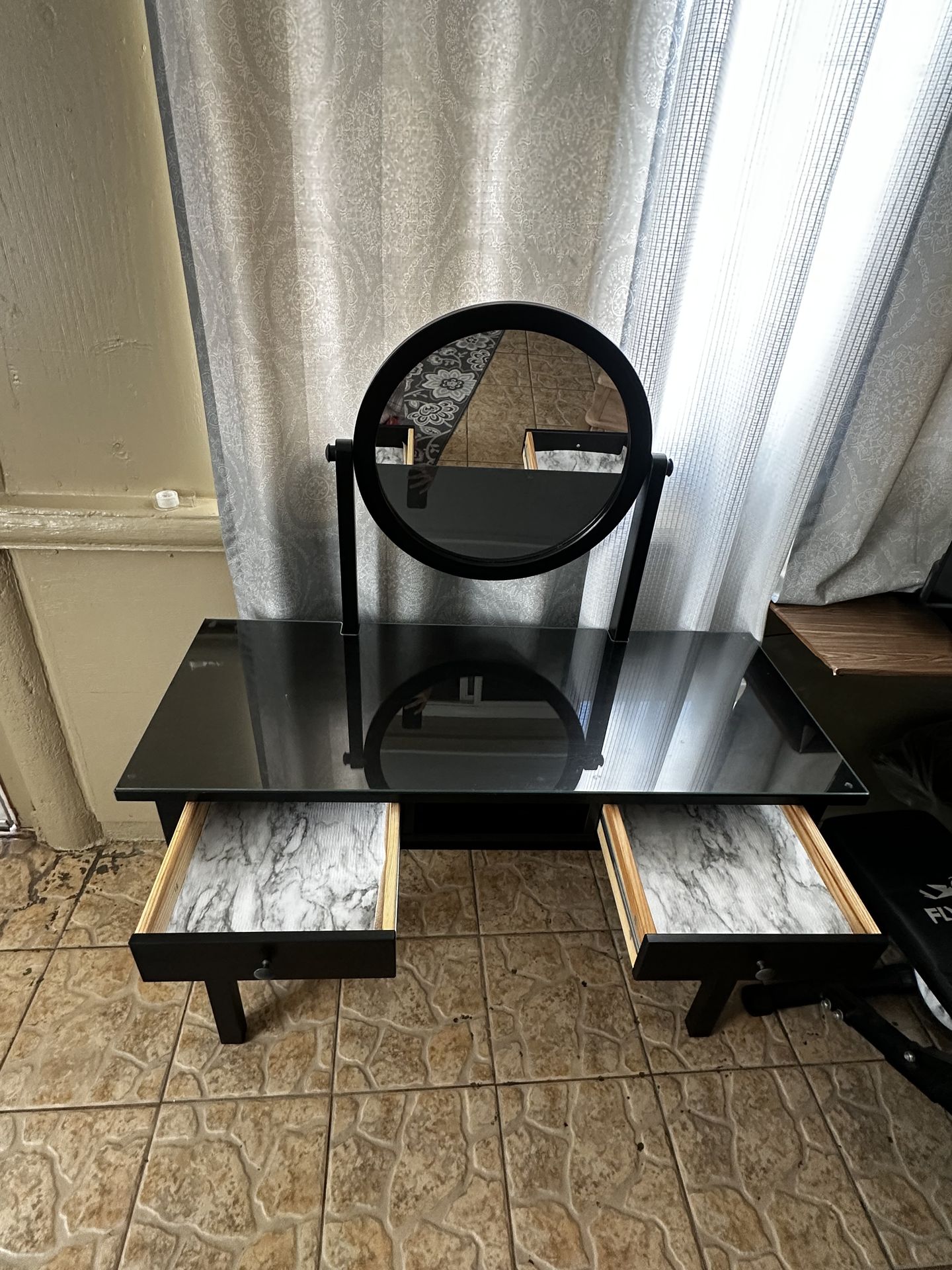 Wooden black vanity w tilting mirror, fully functional cabinets, and a removable glass desktop