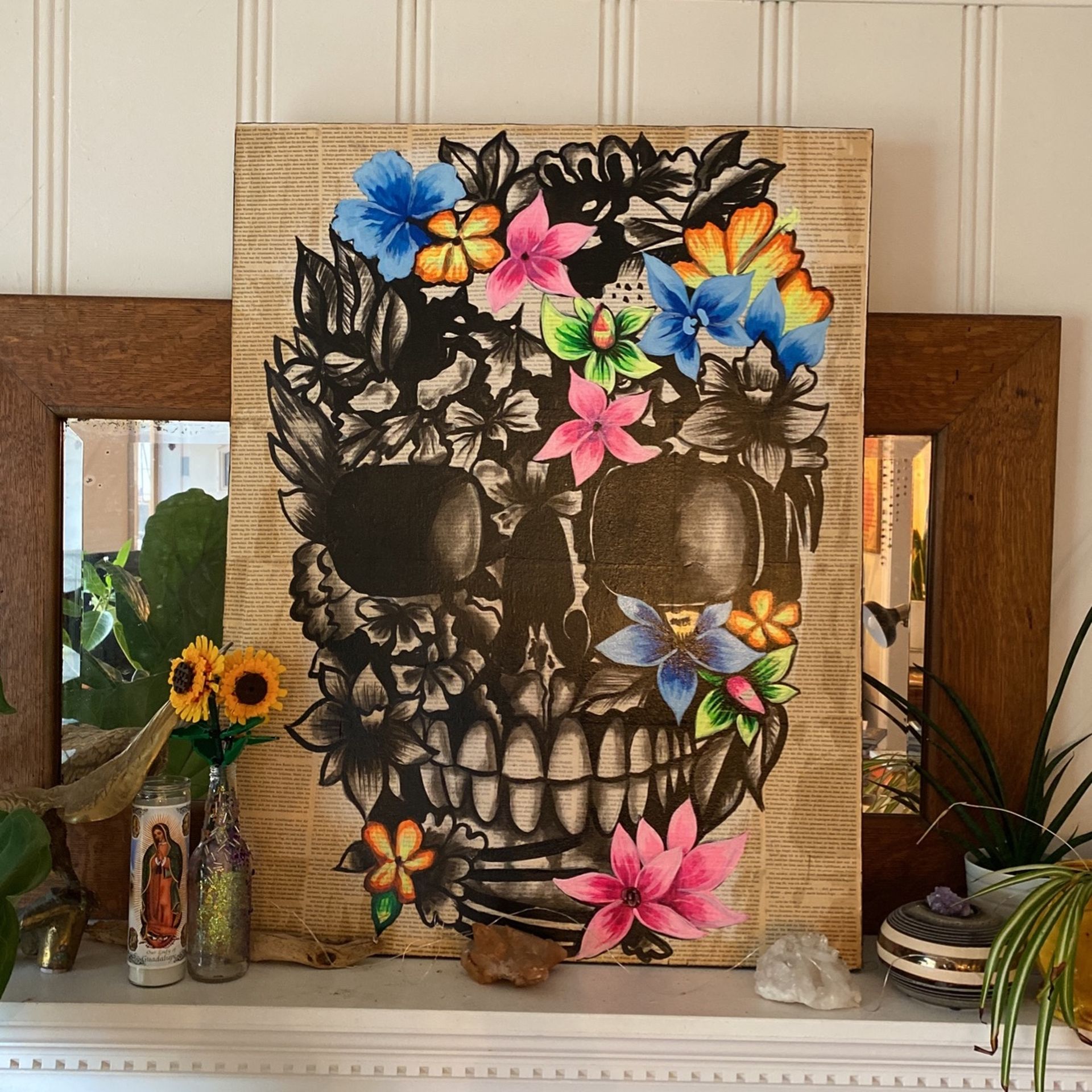 Hand painted acrylic skull painting on canvas with newsprint. Perfect for your Halloween alter or just because. Measures 35.5x27.5in