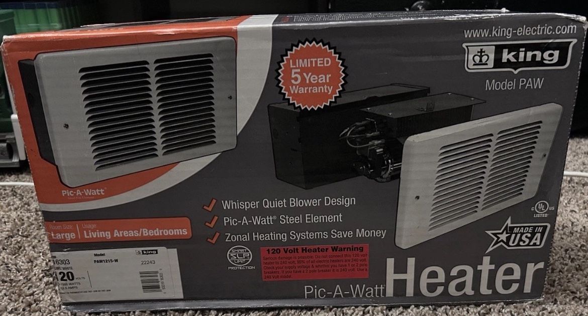 The King PAW1(contact info removed)-Watt 120-Volt Pic-A-Watt steel element wall heater in bright white. Heater is easy to install, fits into standard 2”X4” wall construction, is whisper quiet and allows the customer to select between a range of wattage options. Range: (contact info removed)W Condition is brand new in box. I have 3 for sale. $180 each. Or $460 for all.