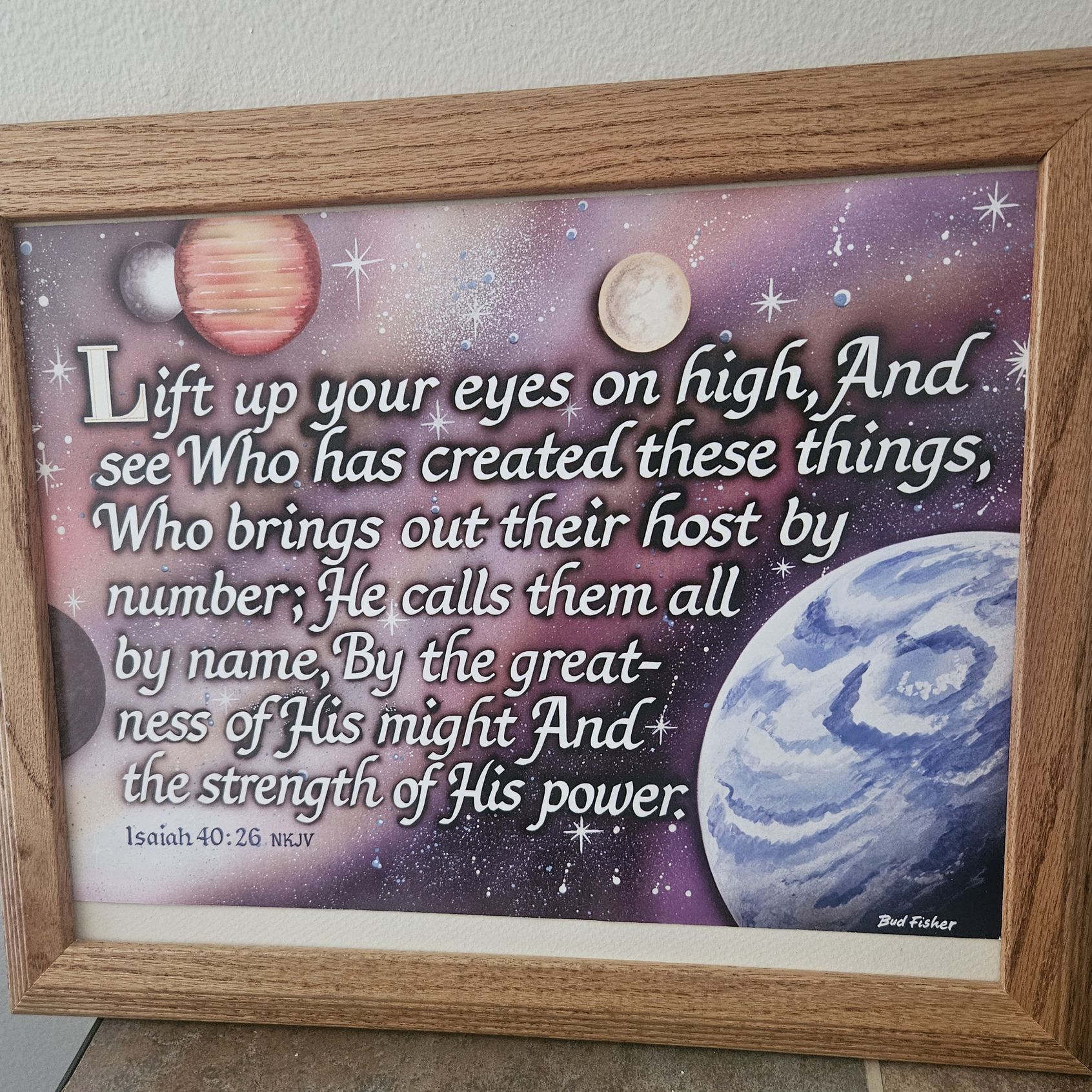 16" x 13" Picture Bible Verse Print in Solid Oak Frame; (Needs Glass)