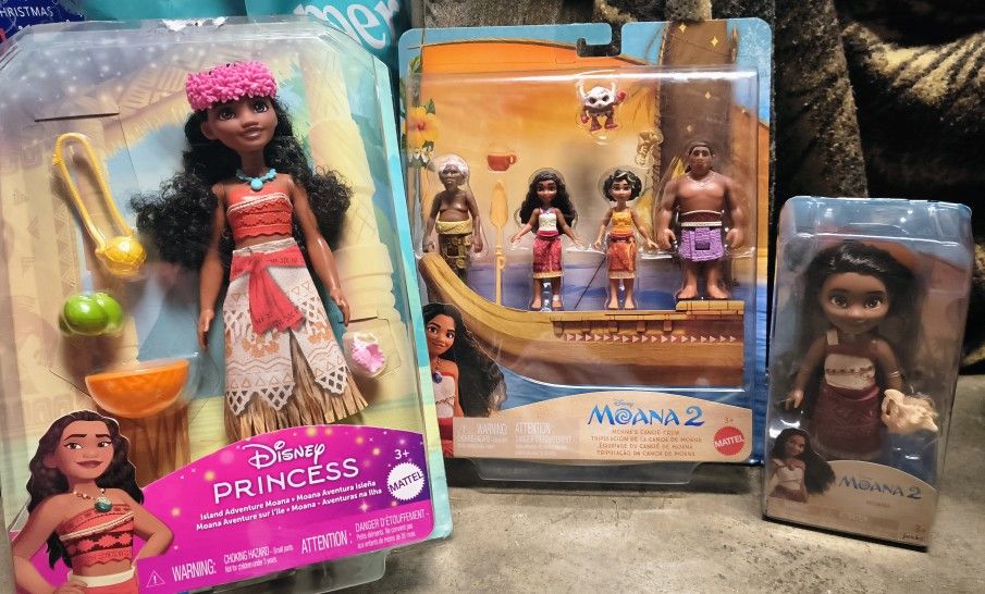 Brand new never opened Moana dolls and doll sets. Would prefer to sell as a whole altogether but can do individuals. •Moana 2 child doll with seashell, ages 3+, $10 obo •Disney Princess Island adventure Moana, ages 3+, $20 obo •Moana 2 "Moana's canoe Crew", ages 3+, $20 obo Or else firm on $40 for all three . Perfect for a last minute Christmas gift.