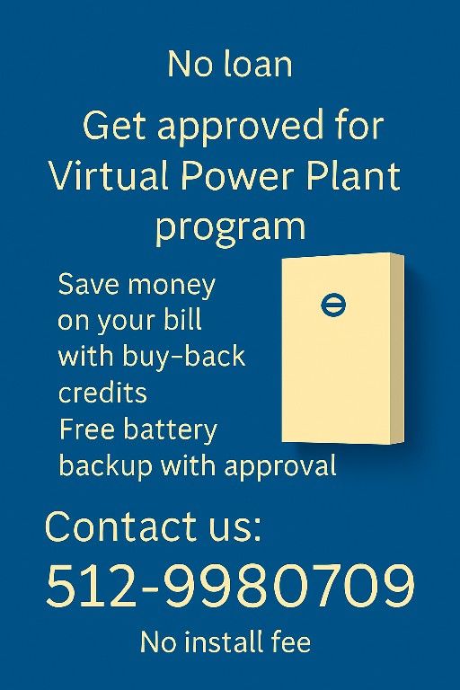 Call us (contact info removed) Get Your Free Personalized Energy Report No Loan • No Install Fee • No Extra Charges Find out if you qualify for monthly bill credits through the Virtual Power Plant Program. ✅ Free customized energy report ✅ No loans or fees ✅ We save you money on a bill you already pay It’s simple—no upfront costs, just real savings. Let’s set up your free consultation today.