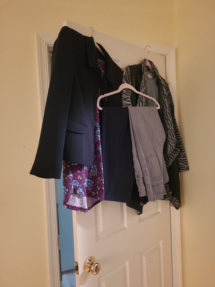 The shirts are Lu La Roe, one black jacket is a blazer, the zebra jacket is a gorgeous art show piece that has a unique zig zag zipper that I wore only twice. The pants are stretch black tights and Grey dress jeans. I am no longer in need of a big professional wardrobe. All six pieces for 40$