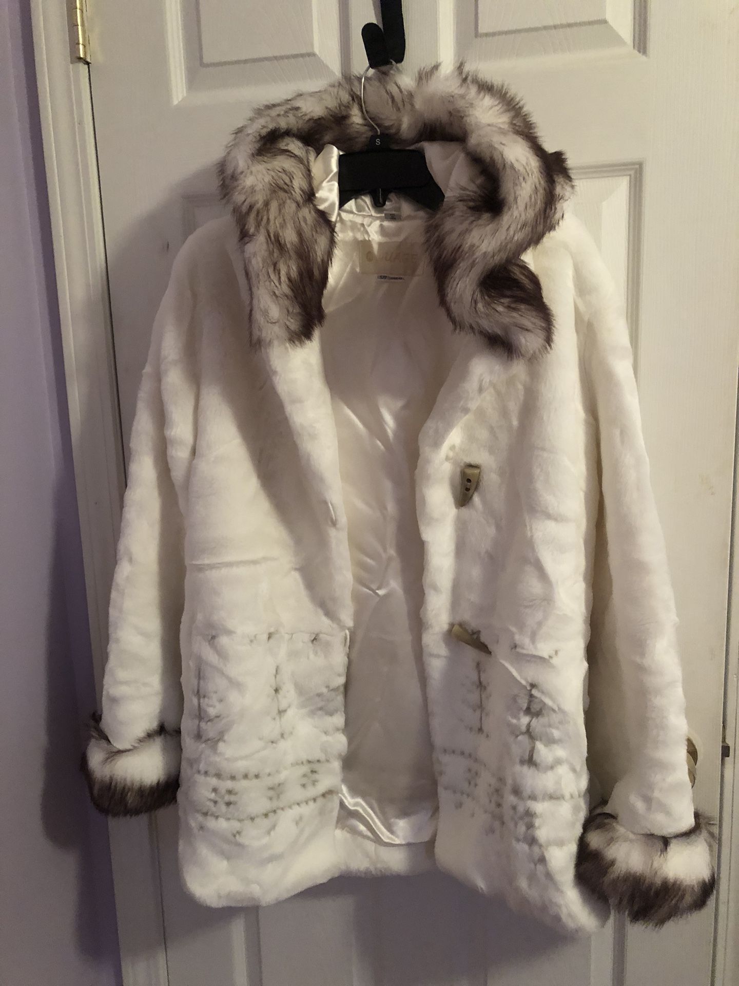 Never worn. Small woman's faux fur coat. Heavy and warm. Very nice coat. In plastic.