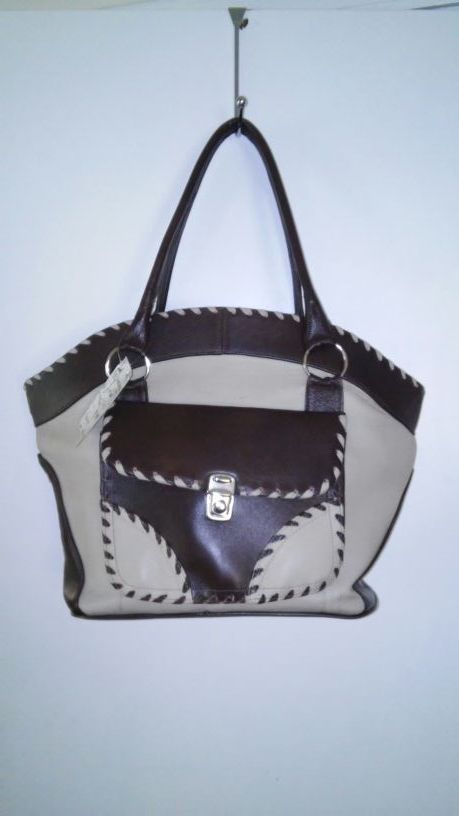 Large handbag. 17 inches wide, 12 inches deep. Genuine leather. Brand new, never used. Tag still attached.