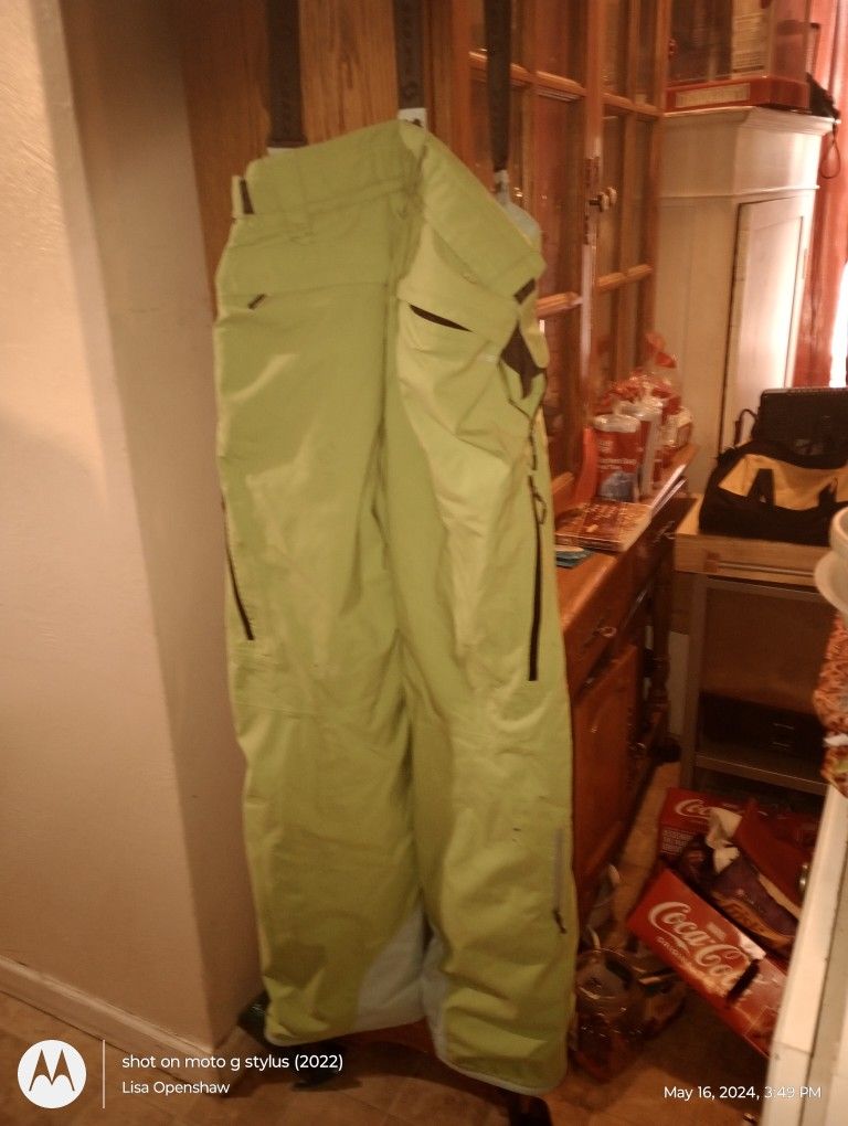 Scott brand name, size large, awesome lime green color with baby blue trim. Detachable suspenders extra pockets, lined The last 2 pics s I believe it's gortex outer. how that these same pants sell for 150 used , so my price is a steal! They're in excellent shape