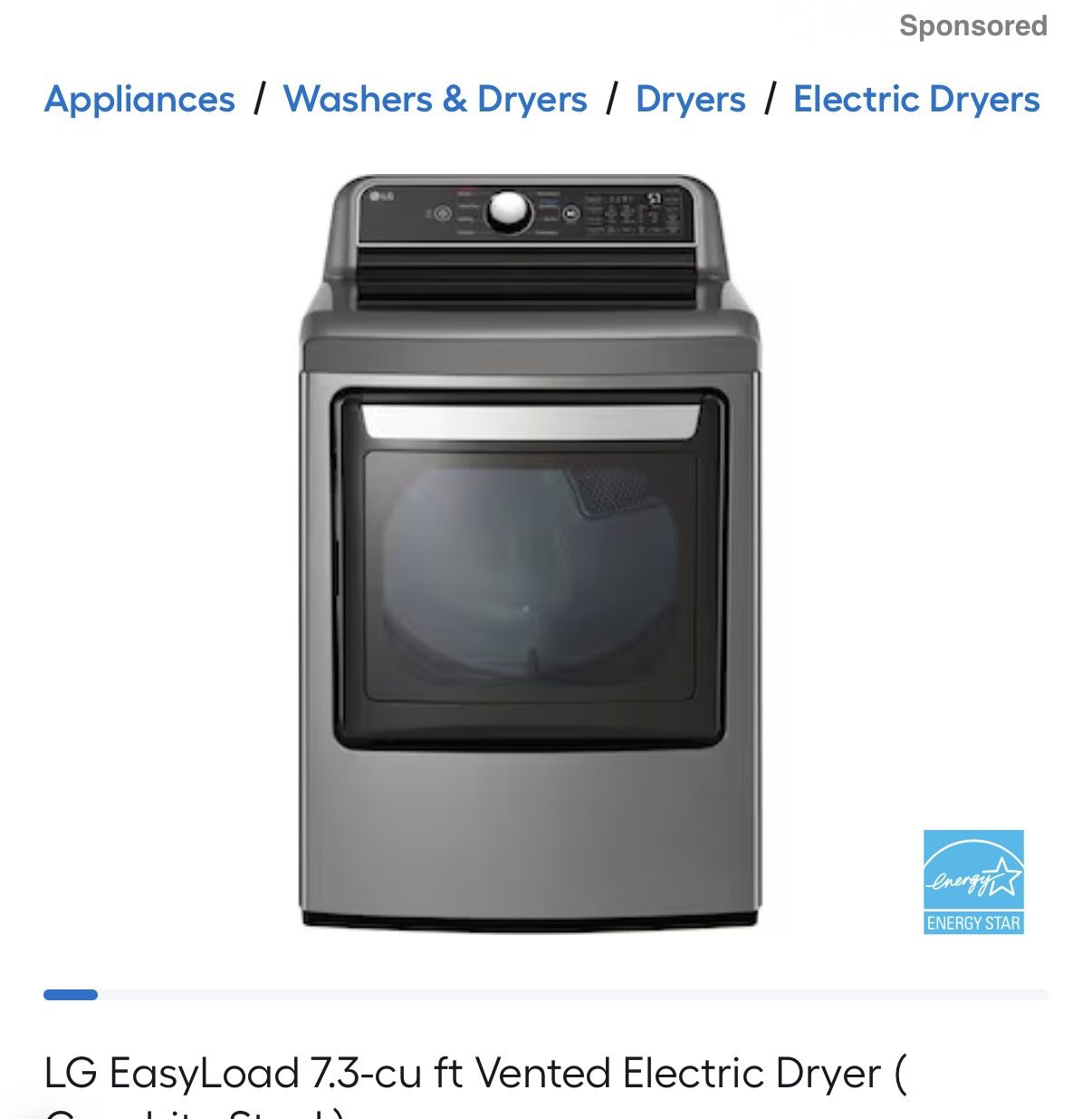 LG Electric Dryer We are selling because we went with the gas dryer in the end. Comes with parts. Happy to help load to your vehicle. Item # 49805six zero Model #DLE7400VE Costs $1k+ at Lowe’s Purchased from Lowe’s EasyLoad 7.3-cu ft Smart Electric Dryer (Graphite Steel) ENERGY STAR QTY 1 Item #: (contact info removed)|Model #: DLE7400VE