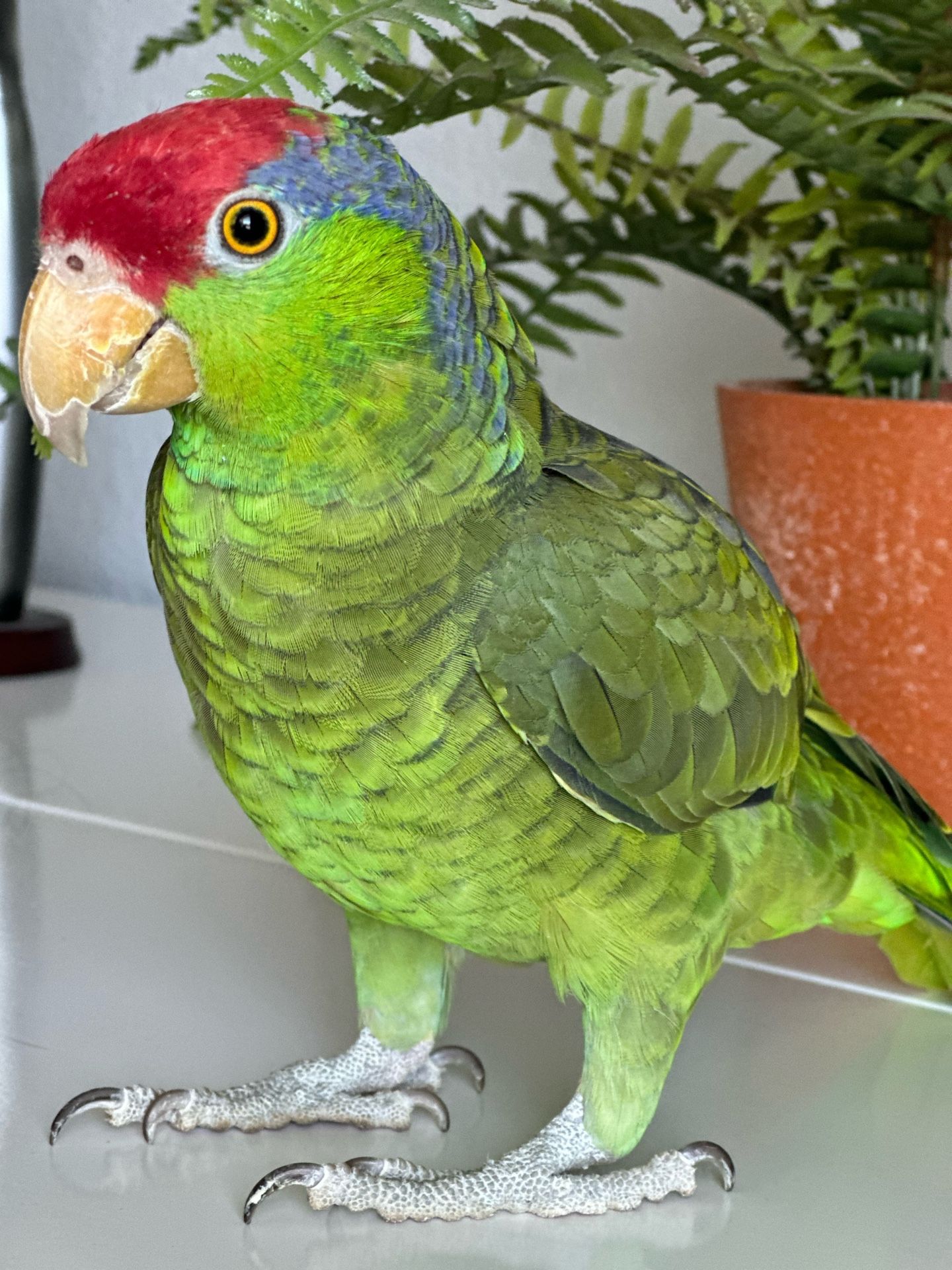Friendly once you get to know the bird very nice..young only a couple years.. we have one that is 37 years old and still doing great this one is only two or three years old very good very moldable for training