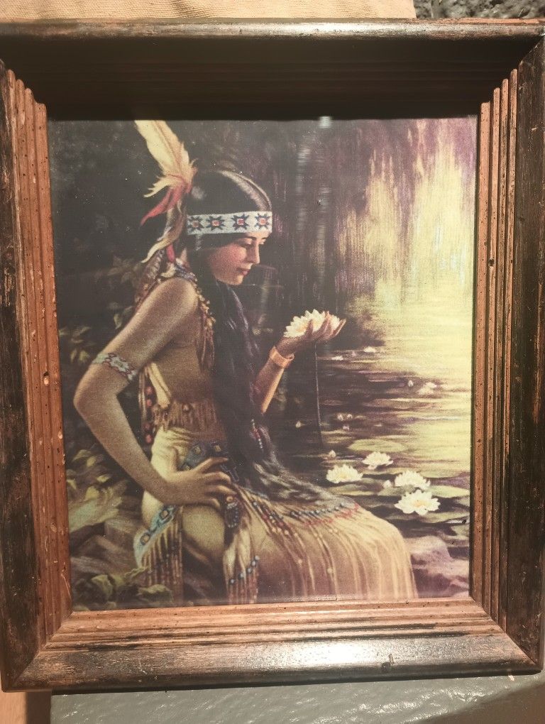 Indian Maiden Holding Water Lily" Artist : Adelaide Hiebel Adelaide Hiebel was an artist and illustrator who worked for the Gerlach Barklow Co. in Joliet, Illinois, a manufacturer of art calendars. Beautiful condition DIMENSIONS: 14.5" H x 12.5" W