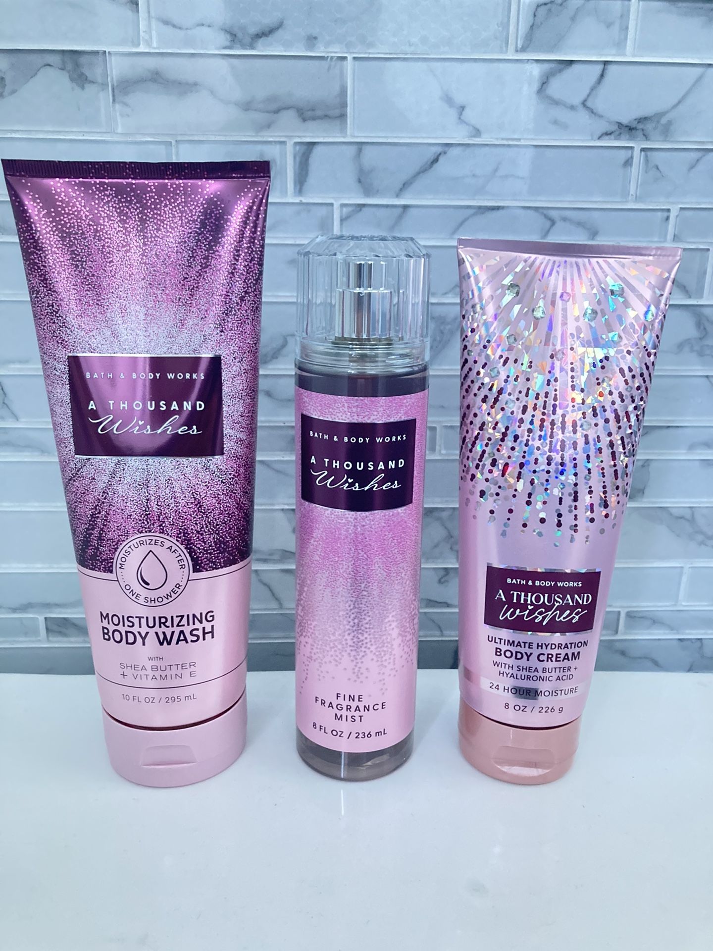 Brand new. Never used and never opened. Bath & Body Works fine fragrance, Ultimate Hydration Body Cream, and Moisturizing Body Wash in scent A Thousand Wishes. Comes from a smoke-free home. All sales final.