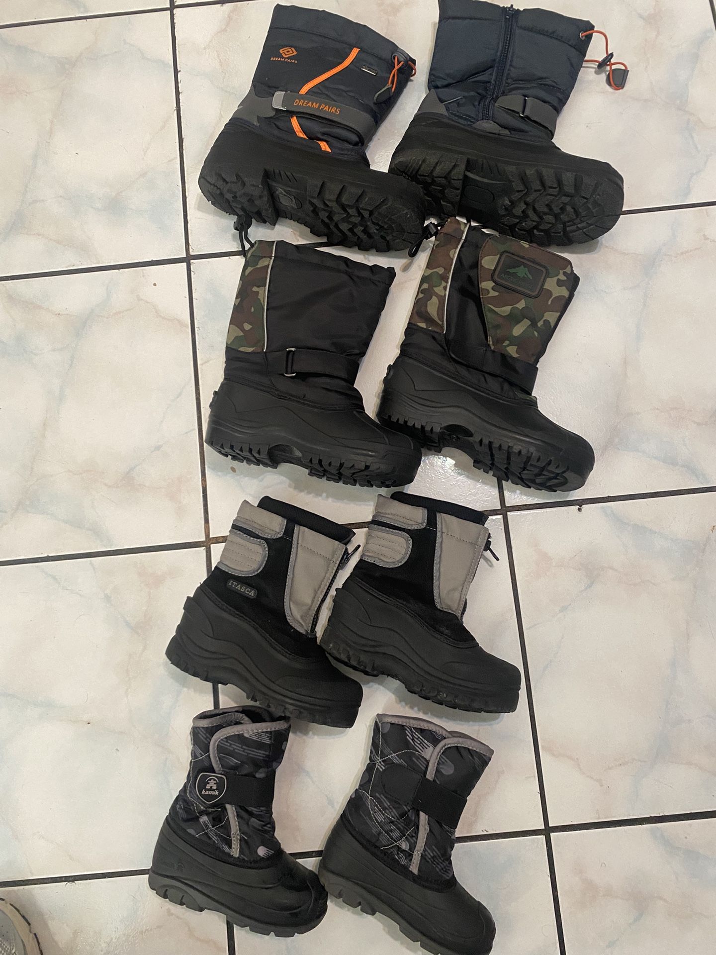 All of them in very good condition Blue/orange size 4 $20 Black/green size 2 $18(SOLD) Black/gray size 12 $15 (SOLD) Black /gray Kamik size 9 $12 Cash only