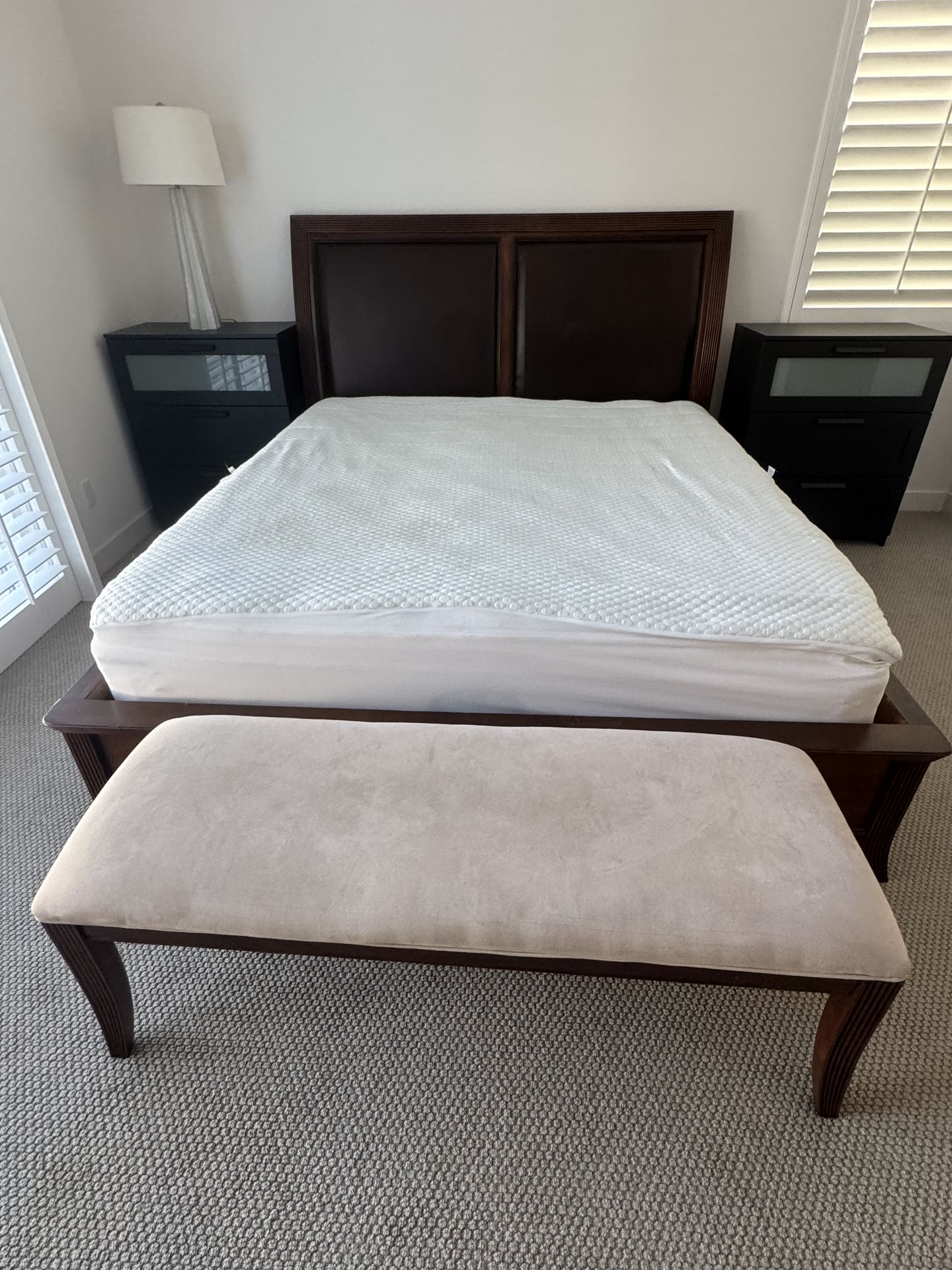 Dark brown wood king bed frame with a simple design. Mattress not included. Comes with a beige upholstered bench. In good condition.