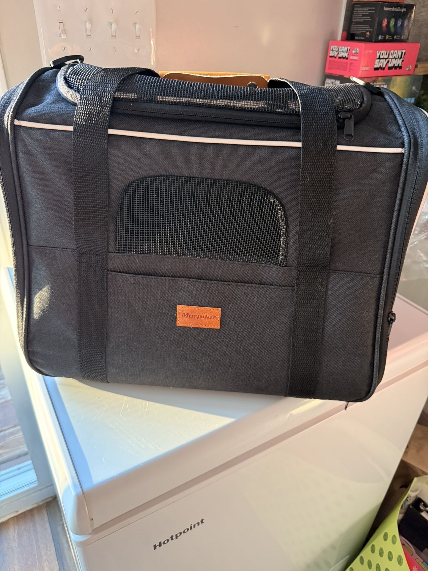 New pet carrier for small to medium dogs. Black gray. Porch pick up.