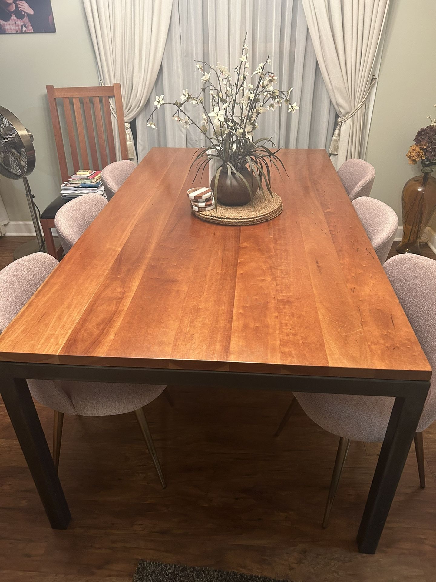 Make an offer! Beautiful solid wood dining table. 3.5 feet by 6.5 feet. Made with a beautiful large piece of solid thick wood with solid iron legs. This guys is heavy and solid. Natural wear and tear on table and chairs. Seats 6 with 4 normal chairs and 2 head chairs. Black leather. Leather has wear. Please ask for more pics of chairs if you are really interested. The leather can be changed out if you want to reupholster them. Chairs are also solid wood. Everything has been around for many mannnny years and will last so many more because they don’t make stuff like this any more. Note. The iron frame legs and real wood make this a heavy table.