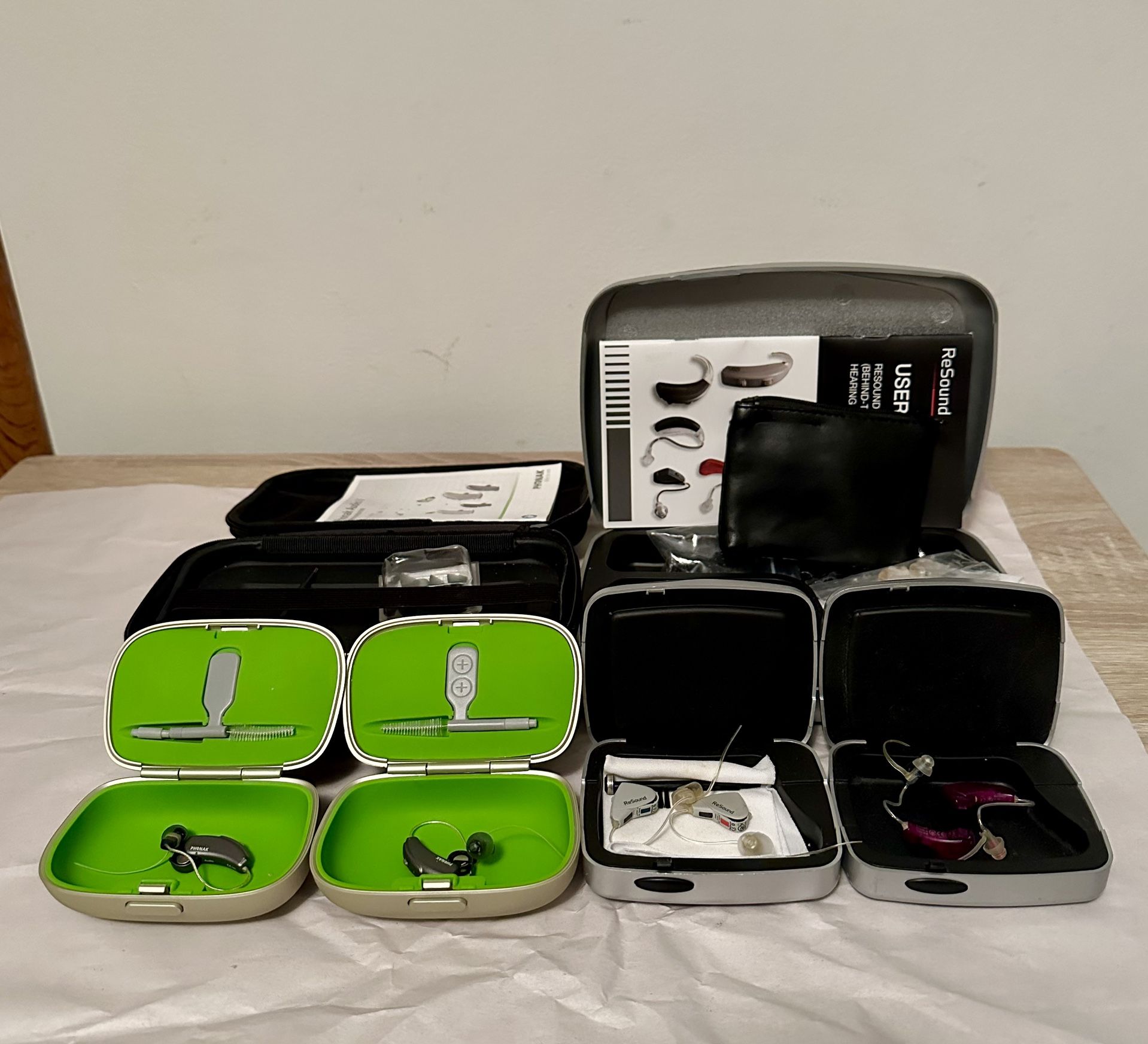 Cross Posted Hearing Aid Lot Phonak Audéo V ReSound BTE In Case With Accessories Used & Untested. - Three used and untested hearing aids, come in case - Comes with accessories/cleaning tools and instruction manual/user guide (please see photos) - Warranty and batteries not included - All three hearing aids come in pairs (right and left ear) Older discontinued models: Phonak V90 3127 ReSound SY312 ReSound 202-LSB-071