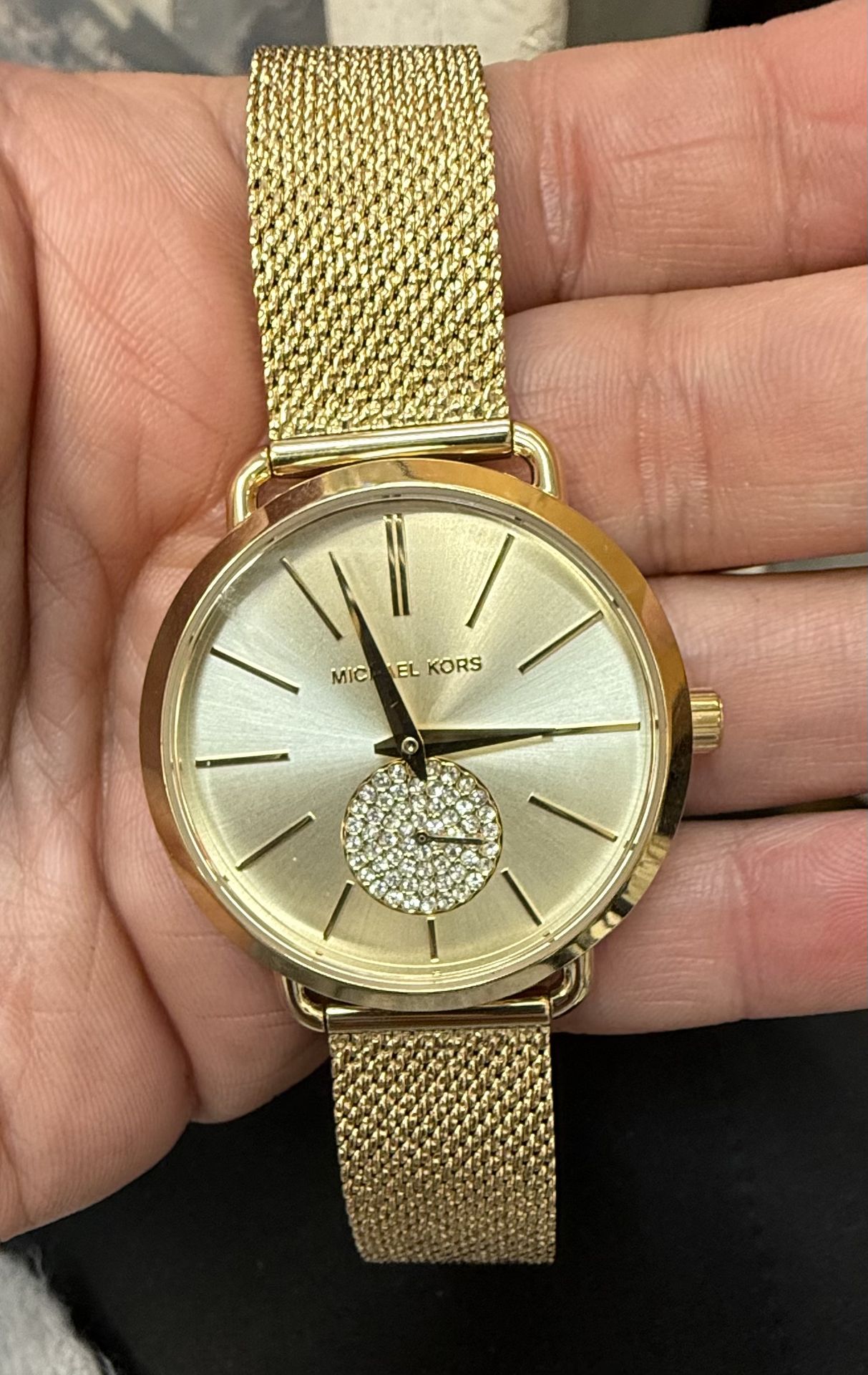 Elegant Michael Kors women’s watch featuring a gold-tone stainless steel mesh bracelet and matching gold dial. Minimalist design with slim hour markers and a beautiful crystal-accent subdial for added sparkle. • Brand: Michael Kors • Case: Gold-tone stainless steel • Band: Gold-tone mesh bracelet • Dial: Gold tone with crystal accent subdial • Movement: Quartz • Style: Slim / dress watch Needs battery