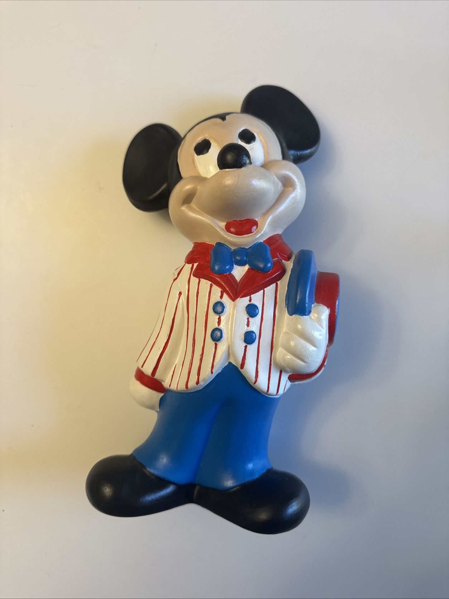 Vintage Walt Disney Mickey Mouse ceramic figurine, dated 1978. Mickey is shown wearing a striped jacket and holding a top hat, a classic collectible design from the late 1970s. This piece is pre-owned vintage condition. No chips or cracks observed. Minor surface wear consistent with age and display. Colors remain vibrant. Please review all photos carefully as they are part of the description. • Brand: Walt Disney • Character: Mickey Mouse • Material: Ceramic • Era: 1970s (1978) • Condition: Vintage pre-owned • Dimensions: Approx. 9” inches tall This is a great addition to any Disneyana or vintage Disney collection.