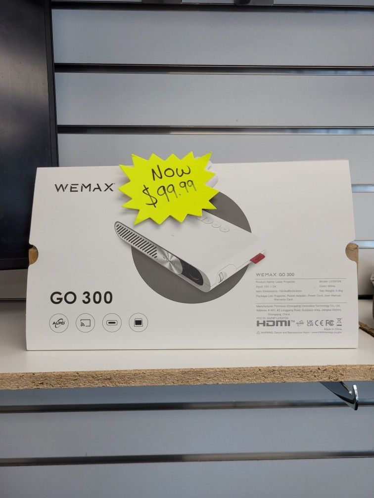 WEMAX GO 300 Laser Projector – Portable HD Mini Projector Take your entertainment anywhere with the WEMAX GO 300 portable laser projector. This ultra-slim, pocket-sized projector offers crisp visuals and HDMI connectivity in a sleek design. Perfect for movies, presentations, and travel. Includes hard shell carrying case, power adapter, and original packaging. Tested and in excellent working condition. Now only $99.99!