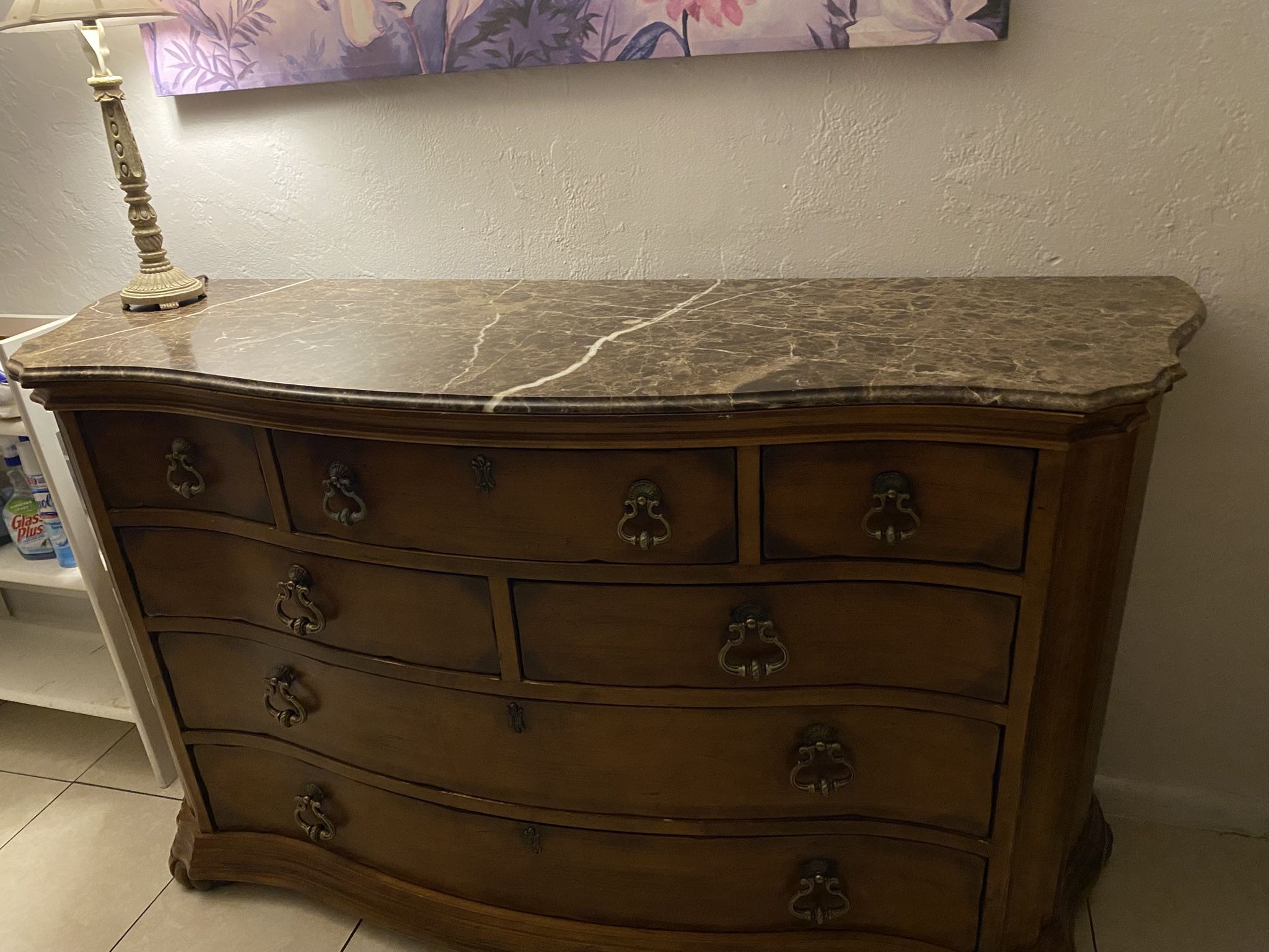 Century Dresser with Brown and white Marble Top. Name Brand: Century Has 7 Drawers Material Fine Wood Heavy Duty Marble Top Brown and White Color Measurements are: 70 inches wide, 40 inches tall, and 22 inches depth.