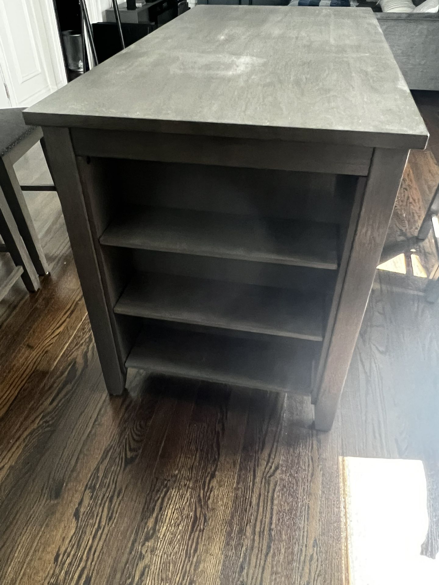 Only used a handful of times, is this beautiful rustic Ashley Furniture dinning table. Come with storage compartments and 4 chairs. Key details: - Only 1 owner - Dimensions: 60" x 30" x 36" - Material: Solid wood - Color: Charcoal gray - Additional features: Storage compartments Don't miss out on this amazing deal! Contact to learn more and schedule a viewing.