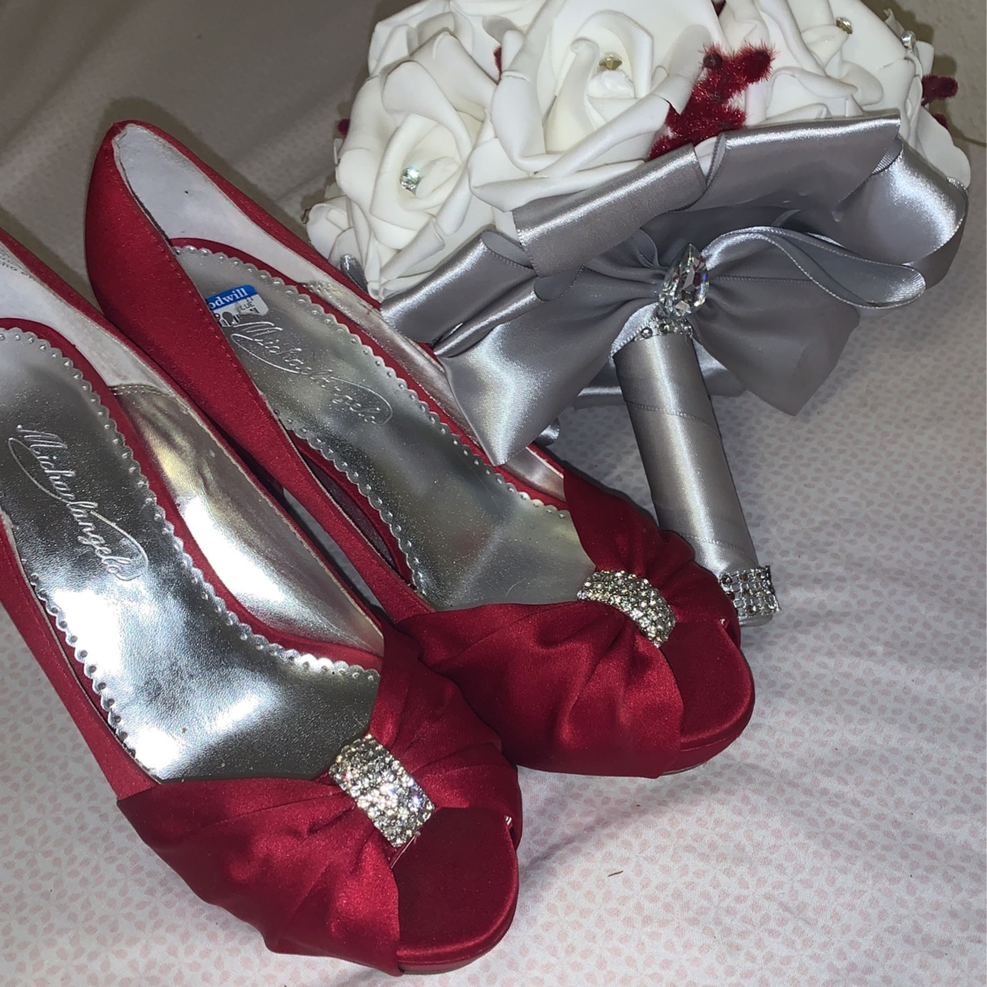Red Wedding Michael Angelo Heels And Red /grey Bouquet To Match